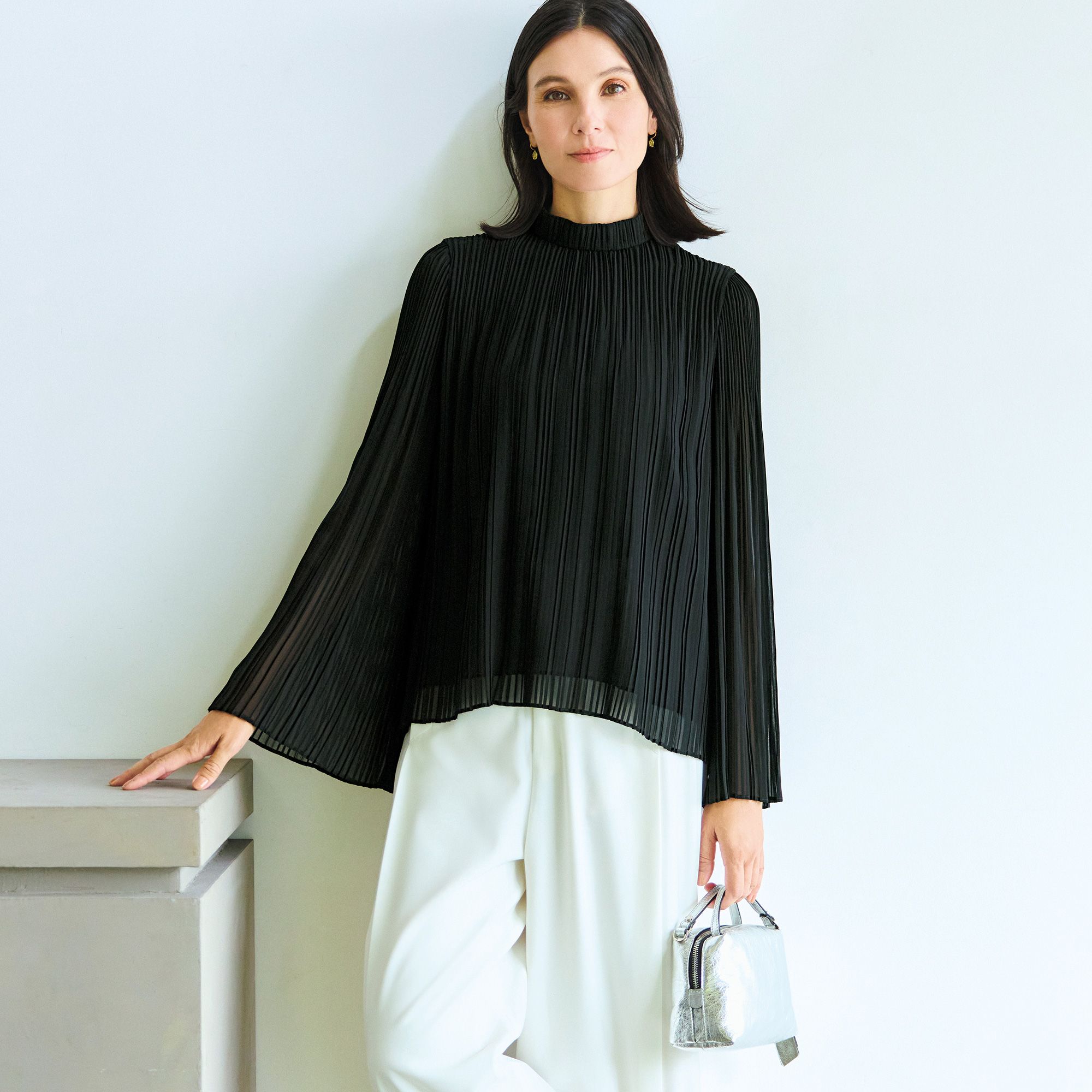 大胆に広がるフレアスリーブは、透け感素材でさりげなく軽やか。スタンドカラーも全体の印象をモダンに引き締めて。繊細な凹凸を描くプリーツは、熟練の縫製技術を誇る国内工場でていねいに仕上げた。身頃は裏地つきで、インナーを気にせず着用できるのもうれしい。袖内側のスナップボタンを外すとスリーブが広がり、シルエットの変化を楽しめる2WAY。