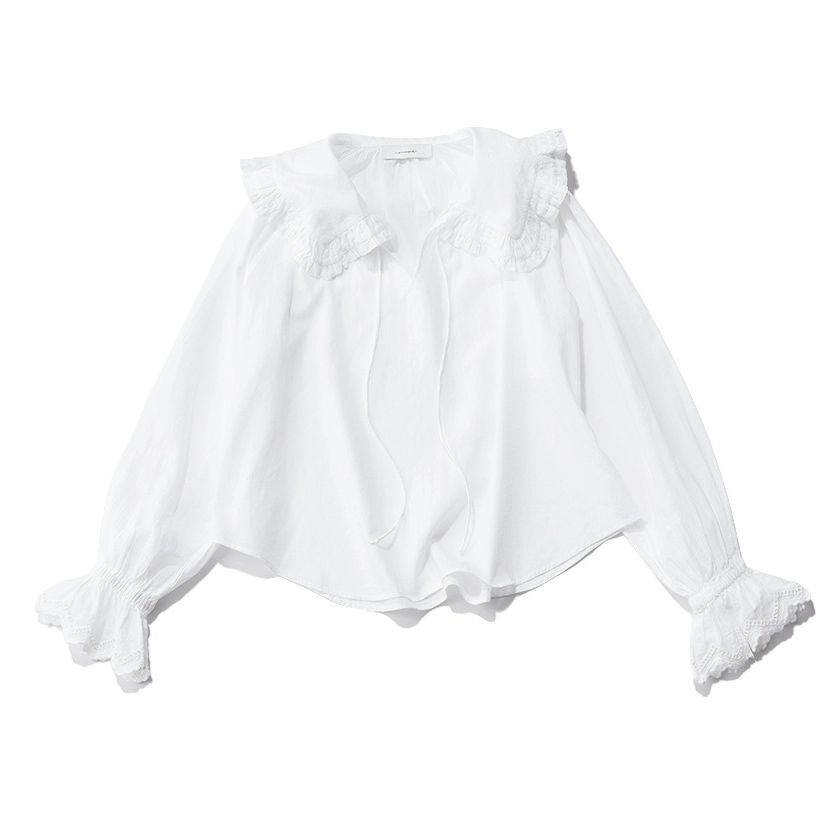 袖口の切り替えカフスとギャザーのボリューム感がポイント。全身淡色でまとめても素敵だけど、ネイビー小物で引き締めるとメリハリのある着こなしに。