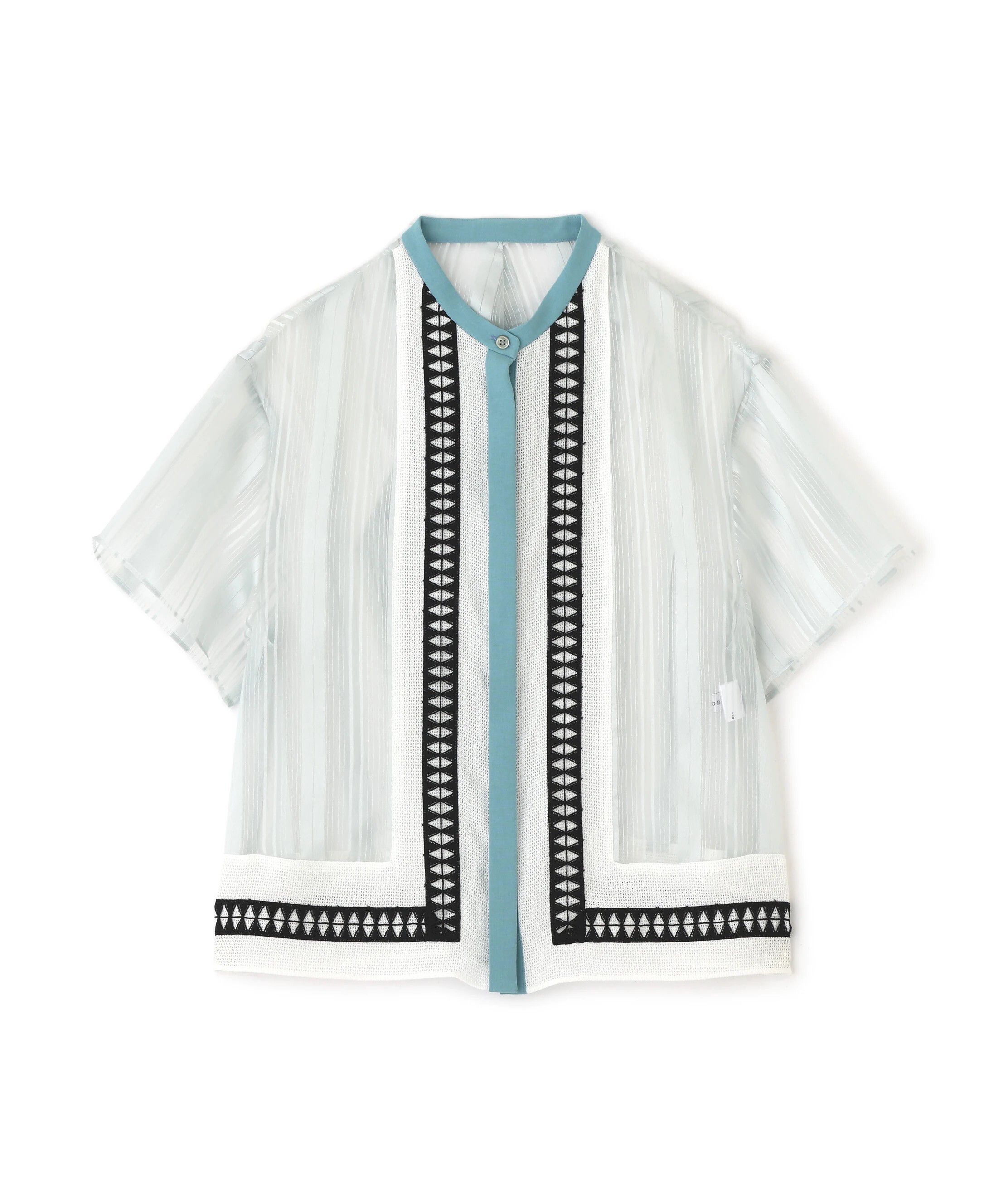 シアーストライプ素材の軽やかなブラウスオリジナルのシアーストライプ素材を使った、バンドカラーの半袖シャツブラウスです。前立て脇〜裾にかけて別地とレースでフレーミングしています。後ろ襟ぐりは大胆な背びれの様なタックをとっており、フロントとは違った雰囲気に仕上がっています。張り感のあるポリエステル分繊糸をベースに使用し、ブライトな光沢感が特徴な太番手ポリエステル糸でストライプを現したシアー感のある素材で仕立てました。※この商品は、ブラック / アイスブルー の2色展開となります。【商品特性】透け感:あり裏地:なし 伸縮性:なし 生地の厚さ:薄め フィット感:普通おすすめ着用期間:春夏おすすめ着用シーン:お出かけ透け感/あり|裏地/なし|光沢/ややあり|生地の厚さ/薄手|伸縮性/なし|シルエット/スタンダード