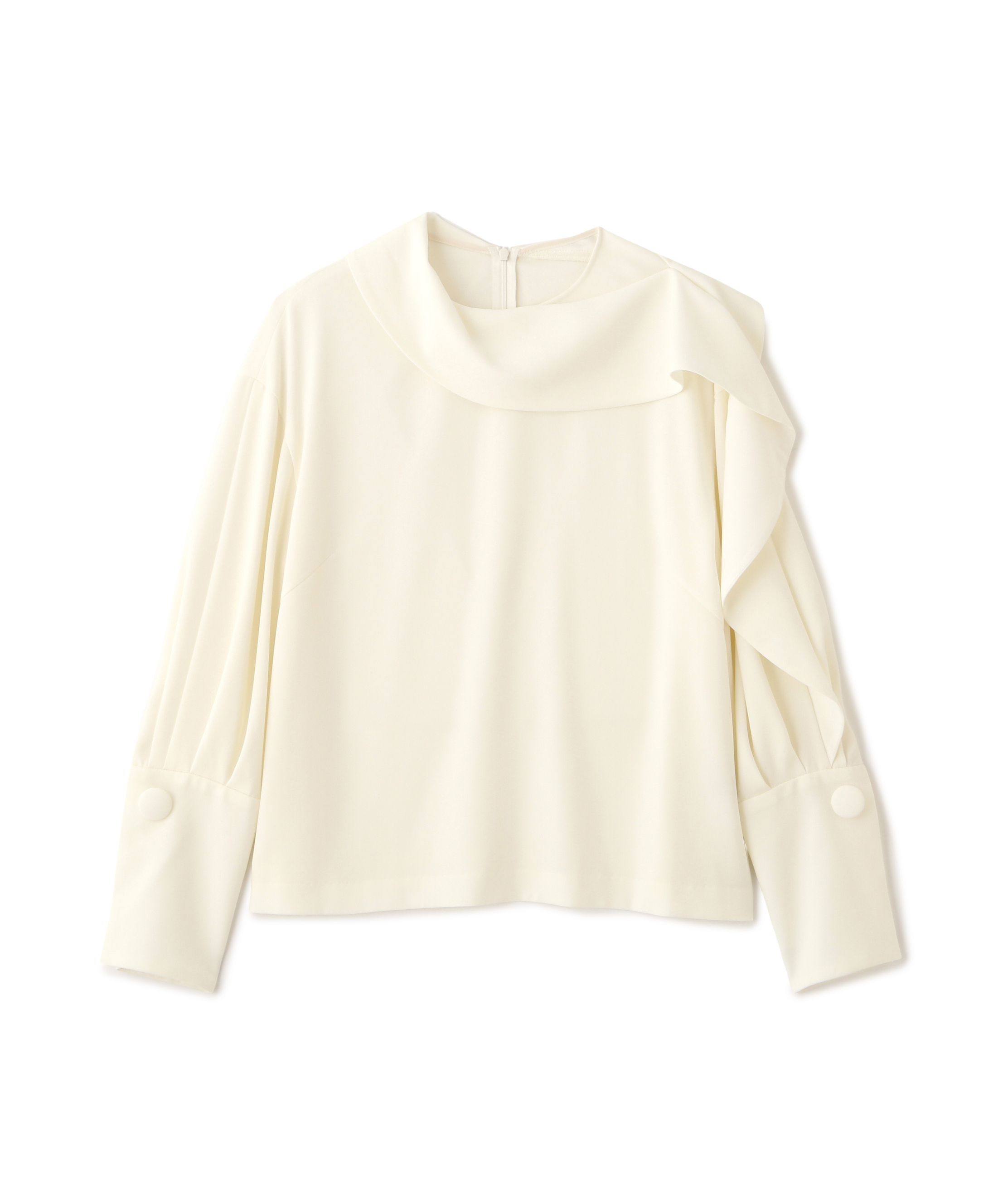 顔まわりを華やかに演出するバックサテンジョーゼットブラウスロールカラーが片袖に向かってラッフルになっていくアシンメトリーなデザインのブラウスで顔まわりがぱっと華やかになります。袖はカフスが長く重心が高い位置でボリュームが出たマトンスリーブの様なバランスの袖になっています。トリアセテートのドレープ性に富んだ、上品な艶感が特徴な素材で仕立てました。※この商品は、ブラック / エクリュ の2色展開となります。【商品特性】透け感:なし裏地:なし伸縮性:なし生地の厚さ:普通フィット感:普通おすすめ着用期間:春秋冬おすすめ着用シーン:通勤透け感/ややあり|裏地/なし|光沢/なし|生地の厚さ/薄手|伸縮性/なし|シルエット/スタンダード