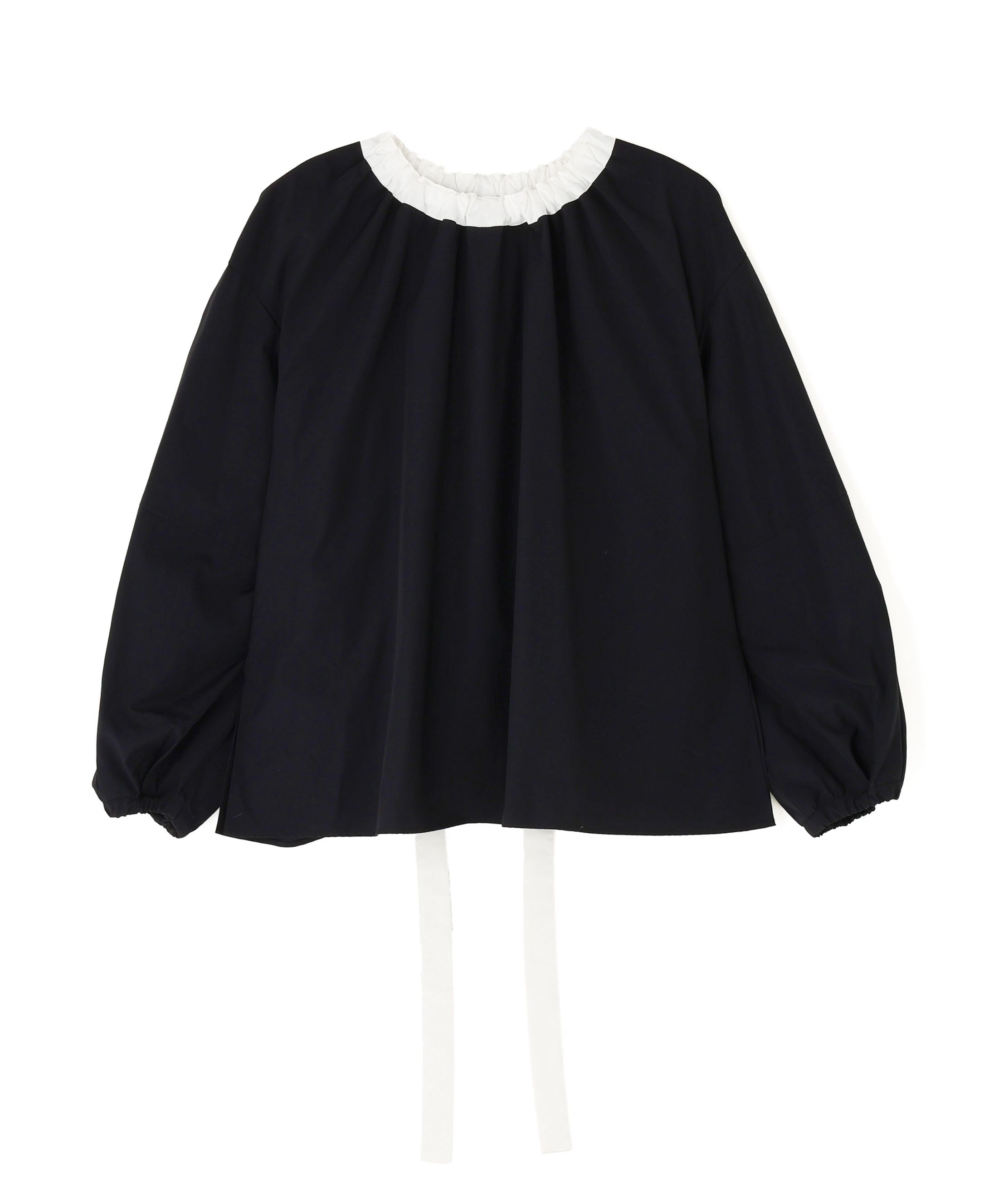 低めのスタンドネックと長めのカフスがクラシックな雰囲気のギャザーブラウス。袖は肘部分を立体的なパターンで作って横の姿も美しい構築的なシルエットに。後ろ中心は襟から続きのヒモを垂らしたようなデザインで、動くたびに揺れるのが素敵です。裾はINでもOUTでも、パンツスタイルにもスカートスタイルにも幅広く合わせやすいブラウスです。※この商品は、ブラック / エクリュ / ブルー の3色展開となります。