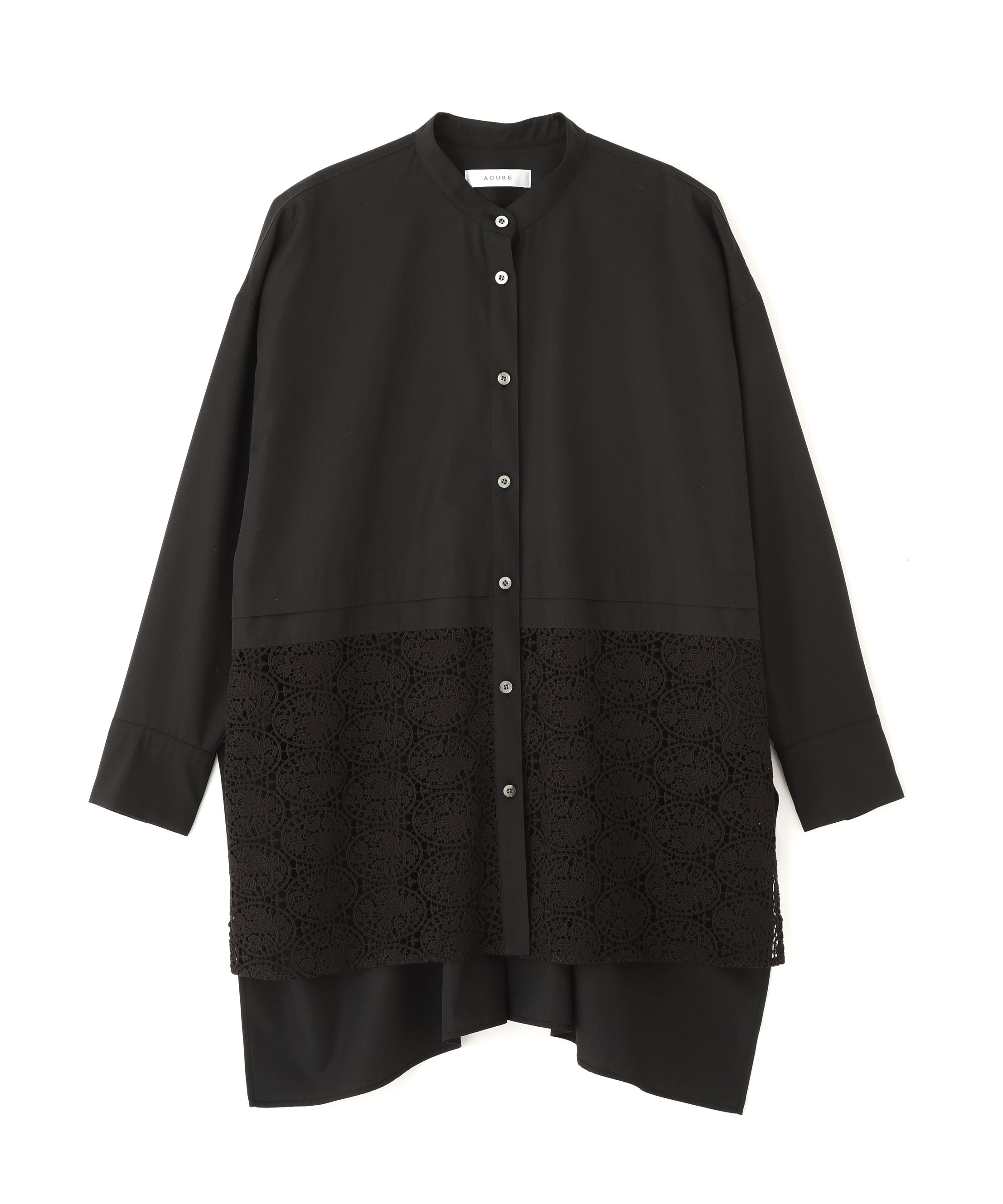 ナチュラル感のある刺繍レースが目を惹くレーシーヘムブラウスポリエステルコットンのタイプライター素材とレースで仕上げられたブラウスです。ややゆとりのあるシルエットで裾部分にレースがコンビネーションされたバンドカラーのブラウスです。ポリエステル/コットンの混紡糸を平織し、仕上げに特殊な反発樹脂加工を施す事でさらりとした風合いに仕上げた素材と、ナチュラル感のあるポリエステルスパンの太番手の糸で刺繍したケミカルエンブロイダリーレースを組み合わせました。※この商品は、ブラック / ホワイト の2色展開となります。【商品特性】透け感:なし裏地:なし伸縮性:なし生地の厚さ:普通フィット感:ルーズおすすめ着用期間:春秋冬おすすめ着用シーン:お出掛け透け感/ややあり|裏地/なし|光沢/なし|生地の厚さ/普通|伸縮性/なし|シルエット/スタンダード