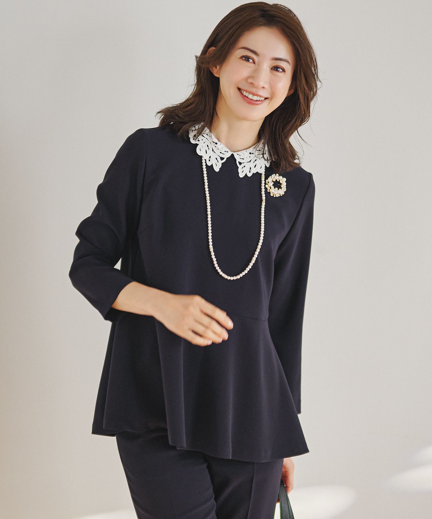 2026 Pre Springセレモニーからビジネスまで。着回し自在な2WAYペプラムブラウス■デザインセレモニーシーンからビジネスシーンまで、幅広い場面で活躍する23区定番素材スーツシリーズのブラウスです。最大の特徴は取り外し可能なレース襟。襟を付ければ華やかでエレガントな印象に、外せばすっきりとしたシンプルなデザインになり、シーンや気分に合わせて2通りの着こなしをお楽しみいただけます。女性らしいペプラムシルエットは、ウエスト周りを自然にカバーしながら、洗練された華やかさを演出します。同素材のパンツとセットアップで着用すれば、統一感のあるきちんとスタイルが完成。ビジネスシーンはもちろんのこと、パールネックレスやブローチを添えれば、入学式や卒業式などのセレモニー、ご家族行事、七五三、新年のご挨拶といった特別な日にも自信を持ってご着用いただけます。一枚で何役もこなす、着回し力の高いのアイテムです。カラーは明るくやさしい印象で、顔周りを華やかに見せてくれるベージュ(#033)、合わせやすく落ち着いた色合いで、上品なきちんと感を演出するネイビー(#075)、洗練された印象を与える定番カラーで、どんなシーンにも対応できる万能色ブラック(#005)の3色展開です。■素材セレモニーやビジネスシーンに着ていただけるタテ糸にトリアセテート、ヨコ糸にポリエステルを使用した二重織りのジョーゼット素材です。ソフトなハリ感のある風合いと適度な生地の膨らみが仕立て映えし、軽やかさを兼ね備えた丁度いい肉感に仕上げました。ナチュラルストレッチなので、ストレスフリーに着こなして頂けます。ご自宅で洗えるイージーケアも嬉しいポイントです。▼同シリーズテーラード ジャケット(品番:JK23SS0002)ノーカラー ジャケット(品番:JK23SS0003)ジレ(品番:JKWOLS0004)シフォンスリーブ ワンピース(品番:OPWOLS0002)襟つき ワンピース(品番:OPWOLS0003)ペプラム ブラウス(品番:BLWOCS0002)テーパード パンツ(品番:PR23SS0002)フルレングス パンツ(品番:PR23CS0003)※画像はサンプルを使用している為、実際にお届けする商品と仕様が異なる場合がございます。