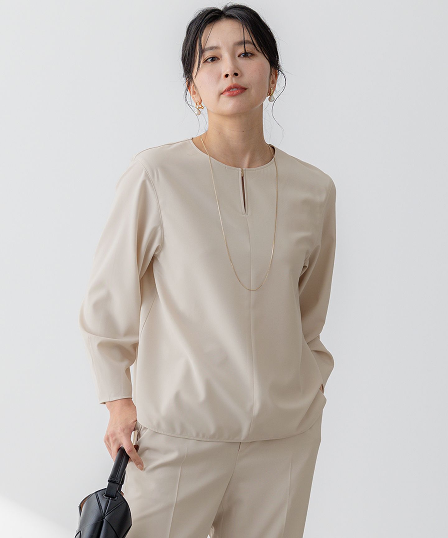 2025 Spring & Summerお手入れもしやすい、着心地抜群のきれいめブラウス■デザインフロントのメタルホックが目を惹く、1枚で着映えるイージー素材のブラウスです。肌離れのいいストレッチ素材で着心地もよく、シャキッとした表面感がきれいめに導いてくれます。きちんと見えを叶えたいお仕事シーンでは同素材のボトムスを合わせたセットアップスタイルがおすすめです。カラーは、柔らかく肌なじみの良いベージュ(#033)、ニュアンスカラーのモスグリーン(#053)、オフィスでも映えるシックなネイビー(#075)、様々なシーンに対応できるブラック(#005)、の4色展開です。■素材縦横どちらにもストレッチ性のある素材。ストレッチ性があるため織物でありながら、キックバックも良い素材に仕上がっています。春~夏に最適な肉感でサラッとした肌触りが特徴です。ポリエステルストレッチなのでシワになりにくいのも嬉しいポイント◎。▼同シリーズ2WAYストレッチツイル ジャケット(品番: JKWOGM0320)2WAYストレッチツイル ドロスト パンツ(品番: PRWOGM0320) 2WAYストレッチツイル ワイドパンツ(品番: PRWOGM0321)※画像はサンプルを使用している為、実際にお届けする商品と仕様が異なる場合がございます。