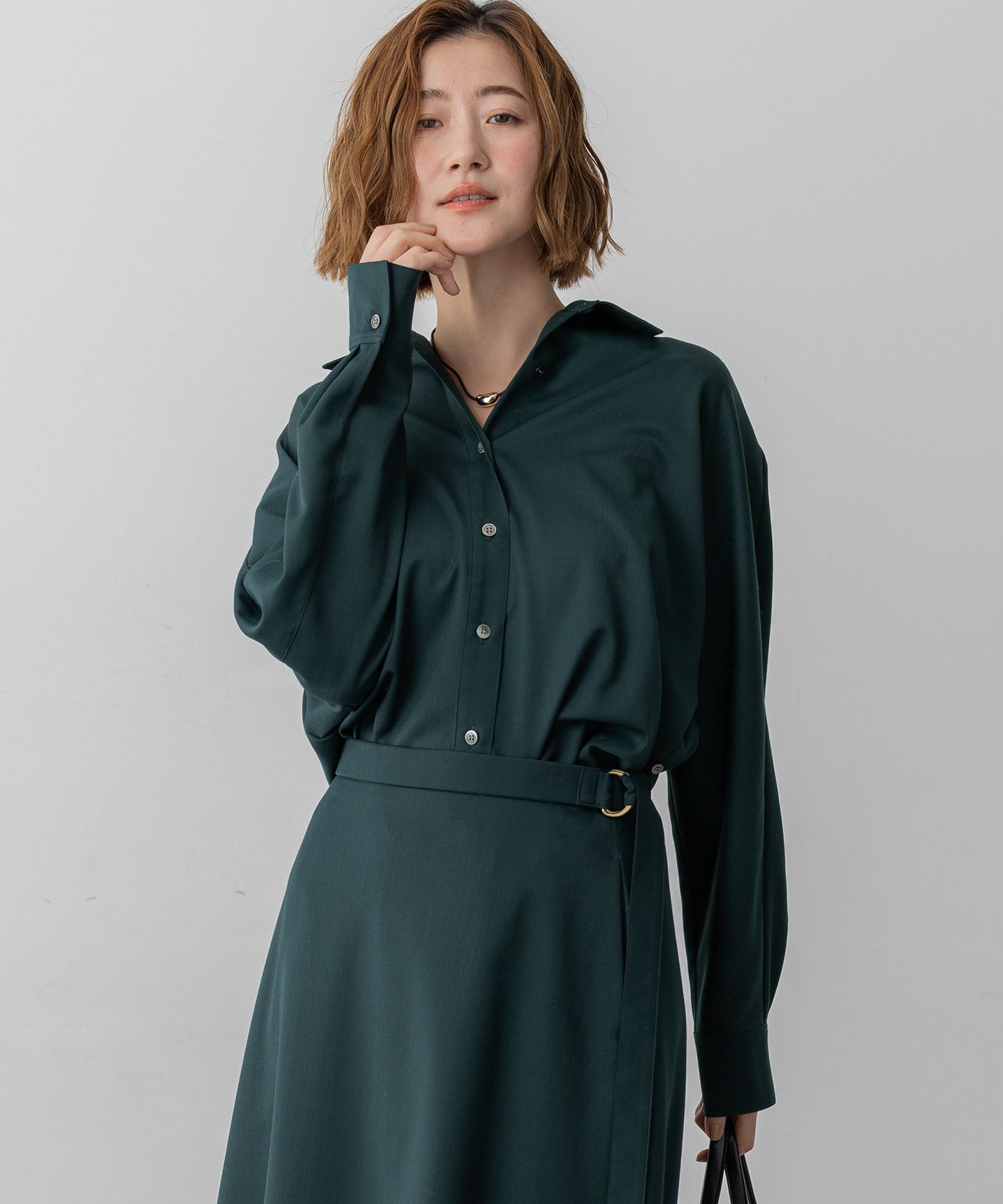 2025 Autumn & Winter上質素材で魅せる、2WAYドルマンスリーブシャツ■デザイン肩から袖にかけてゆったりとしたシルエットが特徴のドルマンスリーブシャツです。リラックス感がありながらも上品な印象を与え、気になる体型をさりげなくカバーしてくれます。脇に配されたボタンを留めることで、カシュクール風の着こなしもお楽しみいただける2WAY仕様です。一枚でさらりと着るのはもちろん、同素材のスカートと合わせてセットアップ風に着用すれば、より洗練された印象に。きれいめパンツと合わせてオフィススタイルに、デニムやスニーカーと合わせてカジュアルダウンするなど、幅広いシーンで活躍し、大人の女性の着こなしを上品に彩ります。カラーはシックで上品な印象を与えるブラック(#005)、深みのある落ち着いたグリーン(#064)の2色展開です。■素材オーストラリア産メリノウールを贅沢に使用した、23区別注の上質なウール素材です。光沢感のある織り方で仕上げており、通常のウールよりも非常に細い糸を使うことで、なめらかで美しい表面感と、深みのある豊かな発色が特徴です。 さらに、特殊なポリエステル繊維を組み合わせることで、快適なストレッチ性を実現しました。動きやすく、ストレスフリーな着心地を叶えます。 静電気を抑える特殊な糸もブレンドしているため、ほこりや毛が付きにくく、いつでも清潔感を保ちやすいのも嬉しいポイントです。▼同シリーズメリノウールサテン スカート(品番:SKWOGW0515)メリノウールサテン ワンピース(品番:OPWOGW0515)※画像はサンプルを使用している為、実際にお届けする商品と仕様が異なる場合がございます。