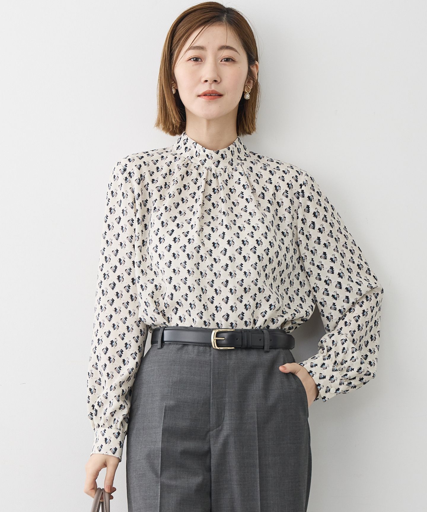 2026 Pre Spring華やぎと着心地を両立したモダンアートプリントブラウス■デザインイタリアの感性が息づく、アートのようなオリジナルプリントが目を引く上品なブラウスです。ベーシックな色合いの中に、さりげなく色味を感じさせる配色と、着用しやすいモチーフサイズが、コーディネートに華やかさを添えます。胸元にあしらわれた繊細なギャザーが、顔周りを優雅に演出し、一枚で着るだけで着映えするデザインです。 ジャケットやアウターのインナーとしても品よくまとまり、オフィスシーンから休日のお出かけ、大切な方との会食など、幅広いシーンで活躍します。 カラーは、知的で洗練された印象を与えるネイビー(#575)、肌なじみが良く、優しく柔らかな雰囲気を醸し出すベージュ(#533)の2色展開です。■素材「モダンアートプリント」は、ポリエステル素材のバックサテンジョーゼットに、美しいオリジナルプリントを施した生地です。表面は、細やかな凹凸感とほのかな光沢が特徴のジョーゼットで、プリント柄を一層引き立て、上品な表情を演出します。肌に触れる裏面は、なめらかなサテン組織になっているため、さらりとした快適な着心地をお楽しみいただけます。 ポリエステル100%なのでシワになりにくく、ご自宅で手軽にお手入れできるイージーケア性も魅力です。▼同シリーズワンピース(品番:OPWOLS6101)※画像はサンプルを使用している為、実際にお届けする商品と仕様が異なる場合がございます。