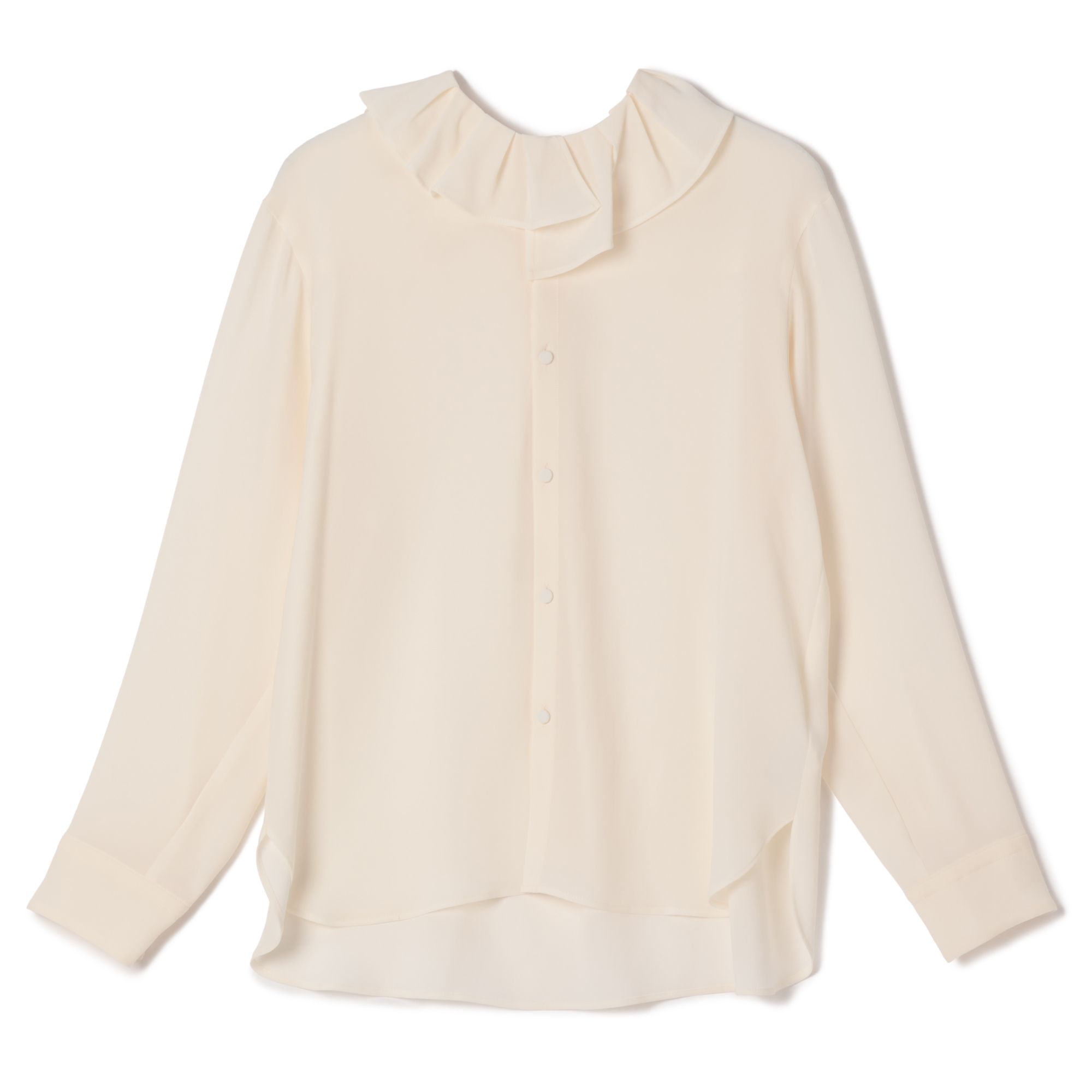 ≪デザインポイント≫センターフロントをアシンメトリーに仕立てた、洗練された表情のブラウス。それに呼応するように、襟ぐりのフリルも左右非対称にデザインされ、静かな個性を引き立てます。胸元に自然な視線を集めるアクセントとして、一枚で存在感のあるスタイルに。≪素材・着心地≫マルティニークでは定番素材のトリアセテートの素材です。落ち感と適度なハリ感がフォルムをキレイに見せてくれる素材です。≪おすすめの着こなし≫クルーネックのニットや、カーディガンと合わせ襟を出すと素敵です。透け感:ややあり伸縮性:あり光沢感:なし裏地:なし生地の厚さ:やや薄い