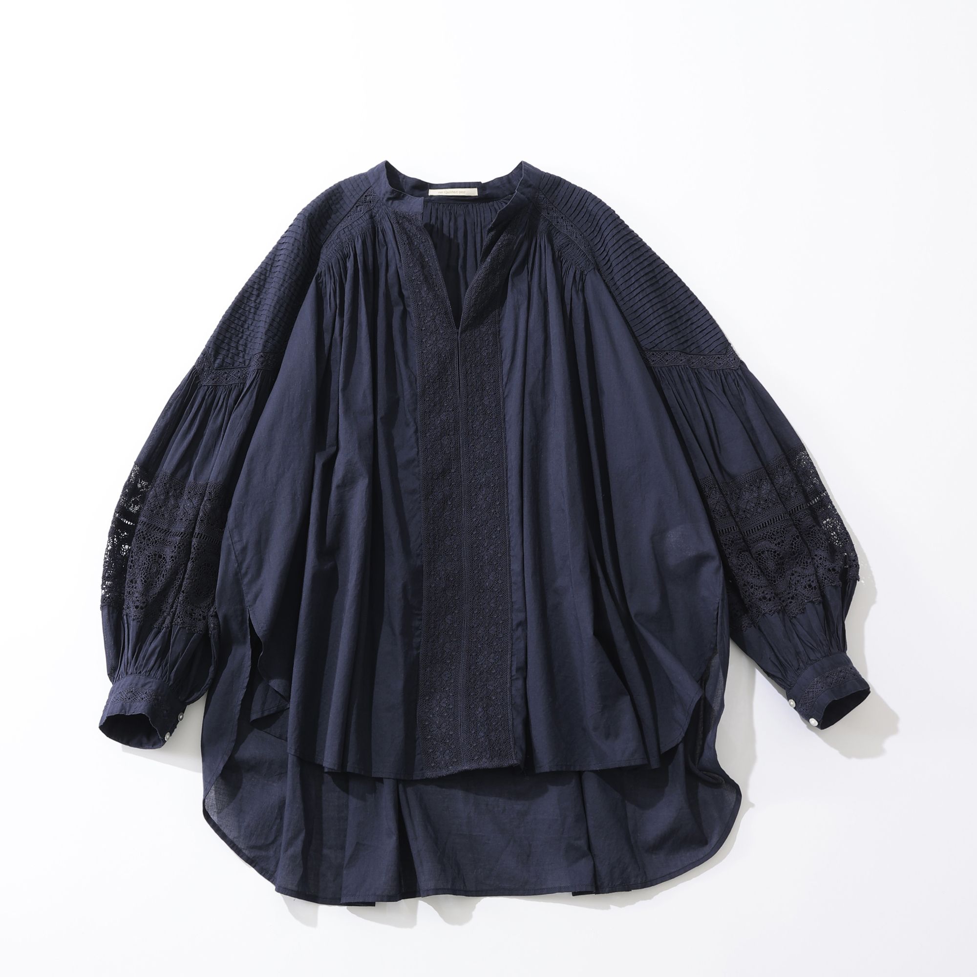 ブランド定番の柔らかいコットン生地が肌に心地よく、風通しのいいゆったりシルエットで長袖でも真夏も快適なブラウス。今年らしいボリュームスリーブは、肩周りにあしらった細やかなピンタックがポイント。袖部分を繊細なレースで切り替えることで、軽やかな透け感をプラス。薄めカラーのデニムとかごバッグを合わせて、どこかフレンチシックに着るのがこの春の気分。