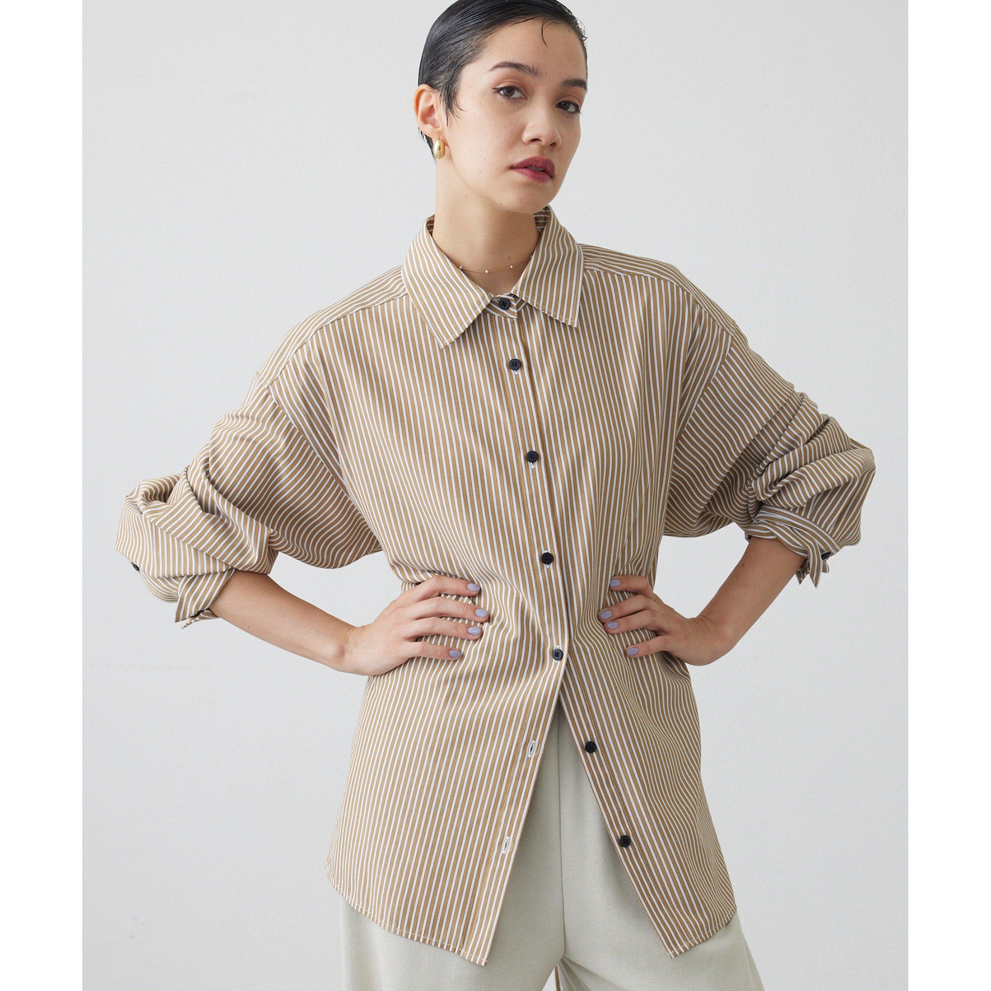 【2025AW】シルエットを変えて楽しめる、着回しストライプシャツ■ストライプ柄がポイントのレギュラーカラーシャツ。■後ろ身頃をレースアップ仕様にし、ウエストをぎゅっと絞ったりシルエットを変えて楽しめるデザイン。■配色のフロント釦も着こなしのアクセントに。■重ね着にも使いやすいレギュラーカラーで、一枚ではもちろんニットインなどにも着回しの効くアイテム。【COLOR】キャメル:大人っぽく上品に仕上げてくれるキャメル。グレー:シャープな印象に導いてくれるライトグレー。----------------------------------------------------洗濯方法:手洗い可透け感:なし裏地:なし伸縮性:なし光沢感:なし----------------------------------------------------― THE PAUSE(ザ ポーズ) ―流行を自分らしい発想で切り取ってコーディネートを遊ぶ。色のグラデーション、ヴィンテージ感漂うワークアイテム・・・ ギャラリーのようなクローゼットの中から 組み合わせをデザインするようにファッションを楽しむ。そんな、自由なライフスタイルをもつ大人の女性にむけて 新しい感覚のカジュアルスタイルを提案します。【注意事項】・画像の商品はサンプルです。実際の商品と仕様、加工が若干異なる場合があります。また 、パソコンやスマートフォンのモニター環境などにより、色味が違って見える場合がございます。・店頭及び屋外での撮影画像は、光の当たり具合で色味が違って見える場合があります。商品の色味は、スタジオ撮影の画像をご参照ください。・入荷状況により、お届け予定が前後する場合があります。・お客様への発送が店頭販売より遅れる場合があります。・追加生産商品は、一部の店舗、通販で販売中の場合があります。予めご了承下さい。