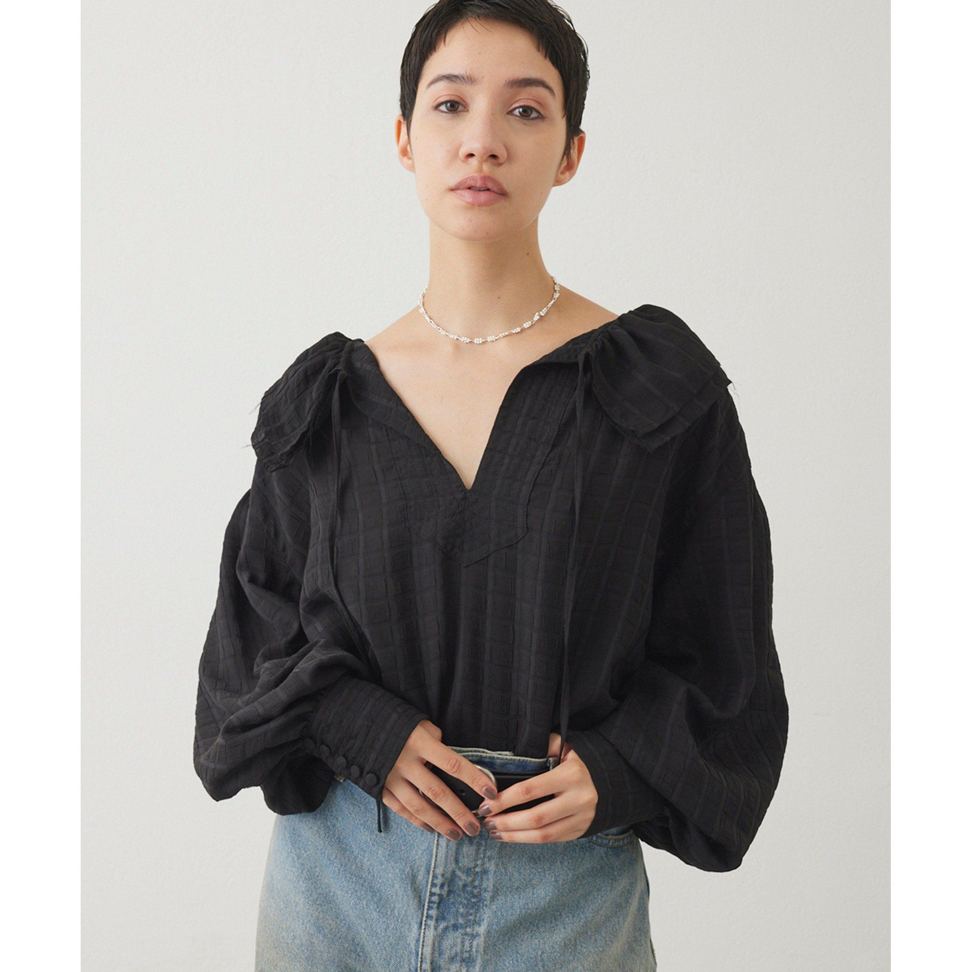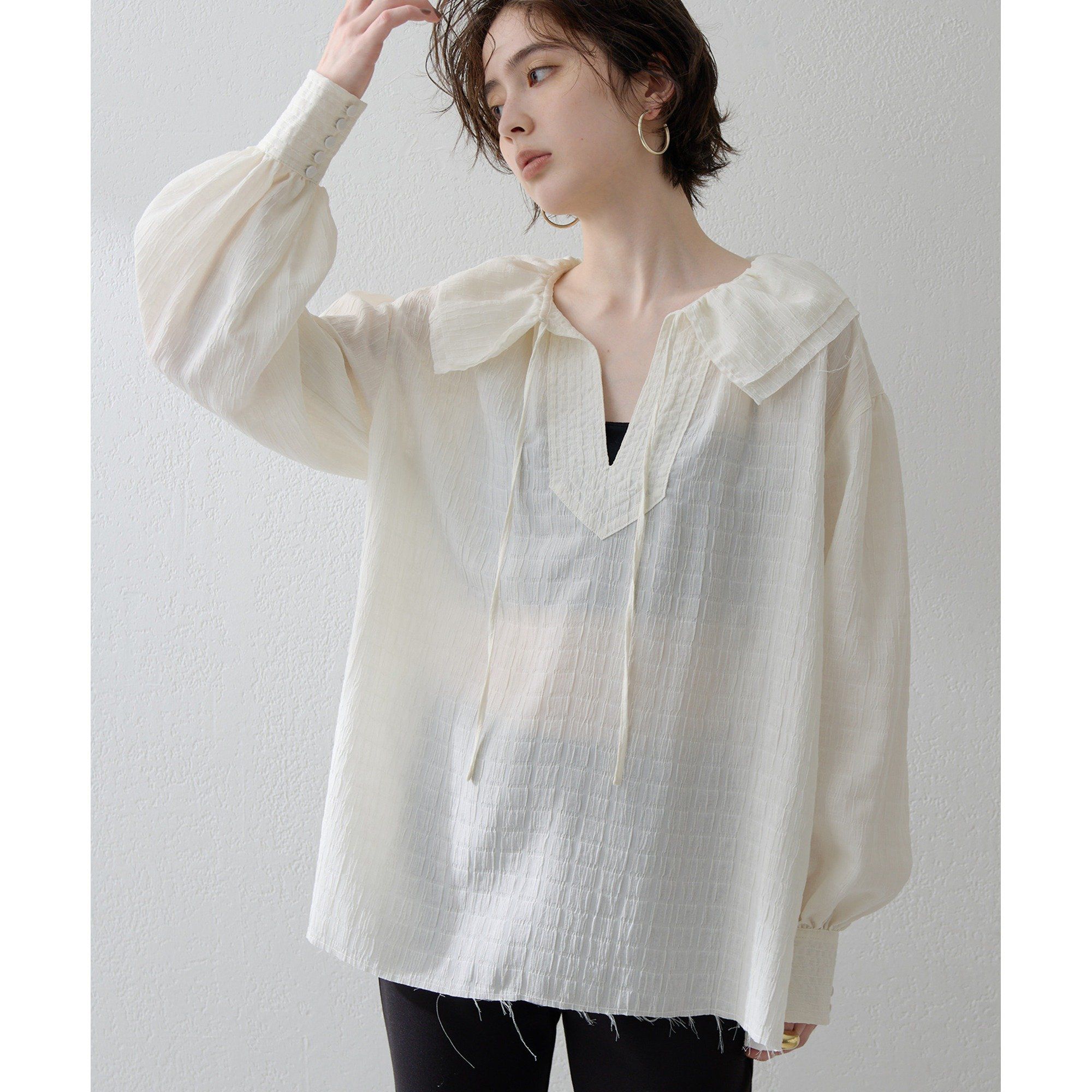【2025AW】ボヘミアンなムードを取り入れたフリルカラーブラウス■衿のフリルがフェミニンな印象のブラウス。■カフスとスキッパー部分のステッチや、シボのあるナチュラルな素材感などボヘミアンな要素を入れたトレンドらしい一枚。■首元はスキッパーですっきりさせて甘すぎないデザインに。■衿や裾は切りっぱなしにして抜け感もプラス。■やや長めの丈感でトップスインでもアウトでもサマになり、様々なボトムとのスタイリングを楽しめるアイテム。※こちらの製品は、デザイン性を重視して襟と裾を切りっぱなしに仕上げています。着用、クリーニングで多少のほつれが生じますのでご了承ください。気になる部分は、引っぱらずにハサミでカットしてください。【COLOR】アイボリー:程よい甘さのあるナチュラルなアイボリー。ブラック:モードなニュアンスをプラスするブラック。----------------------------------------------------洗濯方法:手洗い可透け感:ややあり裏地:なし伸縮性:なし光沢感:なし----------------------------------------------------― THE PAUSE(ザ ポーズ) ―流行を自分らしい発想で切り取ってコーディネートを遊ぶ。色のグラデーション、ヴィンテージ感漂うワークアイテム・・・ ギャラリーのようなクローゼットの中から 組み合わせをデザインするようにファッションを楽しむ。そんな、自由なライフスタイルをもつ大人の女性にむけて 新しい感覚のカジュアルスタイルを提案します。【注意事項】・画像の商品はサンプルです。実際の商品と仕様、加工が若干異なる場合があります。また 、パソコンやスマートフォンのモニター環境などにより、色味が違って見える場合がございます。・店頭及び屋外での撮影画像は、光の当たり具合で色味が違って見える場合があります。商品の色味は、スタジオ撮影の画像をご参照ください。・入荷状況により、お届け予定が前後する場合があります。・お客様への発送が店頭販売より遅れる場合があります。・追加生産商品は、一部の店舗、通販で販売中の場合があります。予めご了承下さい。