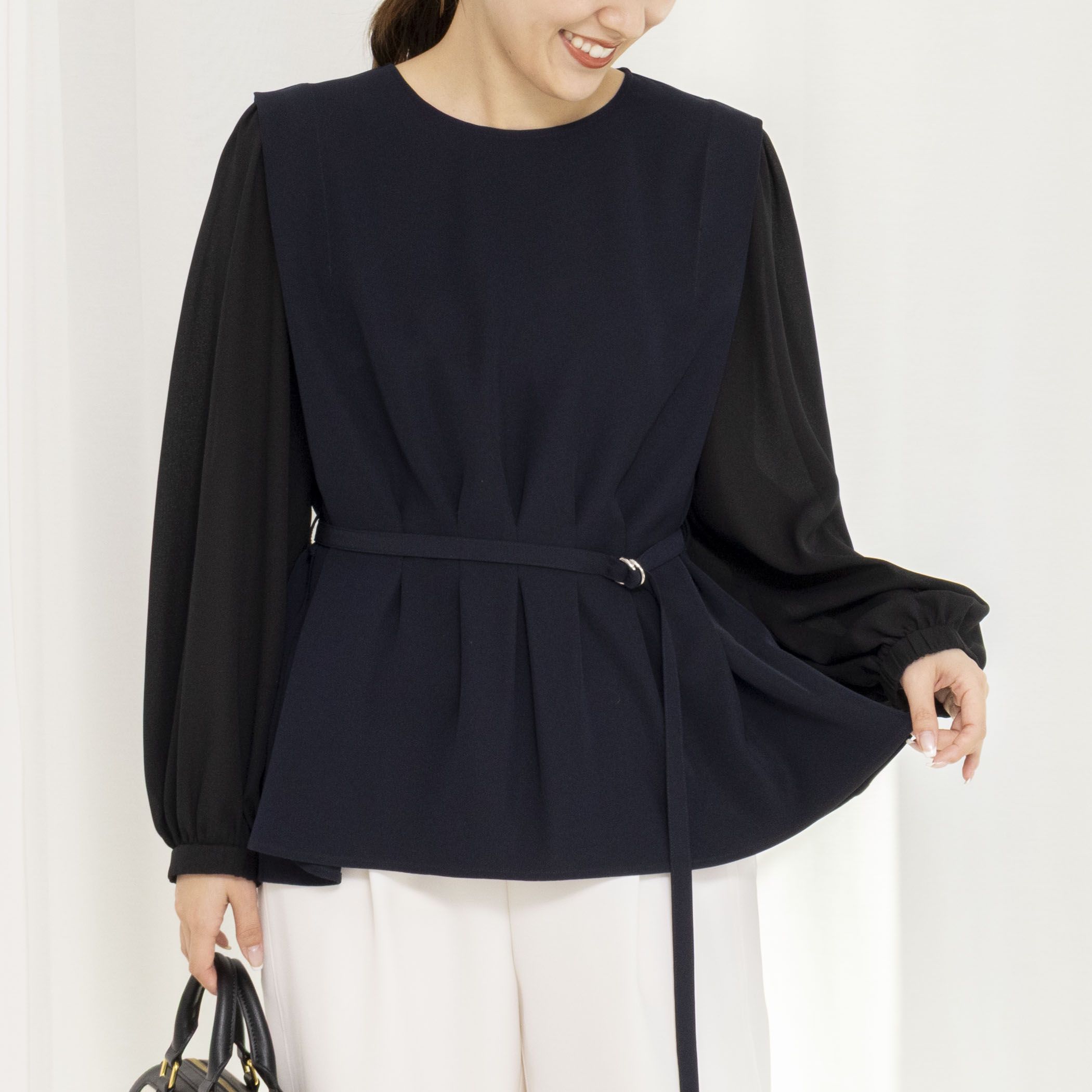 ◇26SS◇NOLLEY'S◆Point・衿ぐり、袖口、裾と配色でトリミングし、レイヤードしているようなデザイン性のあるブラウス・袖口は内側にゴム入りで、たくし上げたときに止まる仕様・縦横に伸縮性があり防シワ加工が施されたウォッシャブル可能な高機能素材・柔らかで繊細なシアー感に加え、伸縮性の高いコットンフライスを使用・サイジングもコンパクト過ぎず、ジャケットやカーデのインナーとして使いやすいアイテム・同素材スリムパンツ(6-0035-1-09-004)、ベルト付きジレ(6-0035-1-04-004)あり・手洗い可●お取扱い上のご注意●末永くご愛用頂くために、アテンションタグを必ずご確認の上、着用又はお取り扱い下さい。気になる商品は、お気に入り登録がオススメです!クーポン情報、入荷情報が、通知されるようになります。※店頭及び屋外での撮影画像は、光の当たり具合で色味が違って見える場合があります。商品の色味は、スタジオ撮影の画像をご参照下さい。※商品画像に関しては出来る限り忠実に表示出来るよう努めておりますが、お客様がご利用のモニターの設定及び特性により、実際の商品と比較し色味に若干の誤差が生じる場合があります。※画像の商品はサンプルとなりますので実際の商品と仕様、加工、サイズが若干異なる場合がございます。
