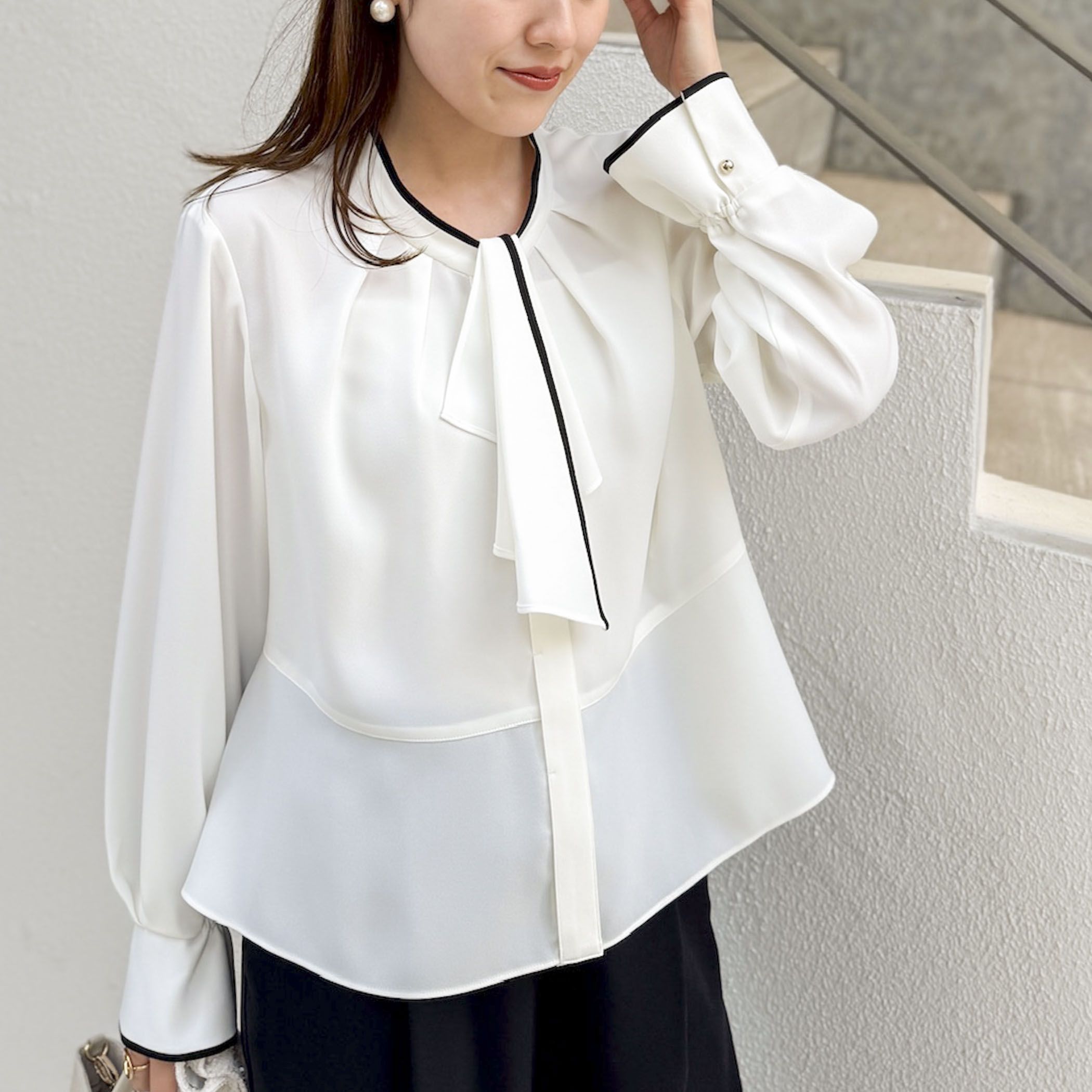 ◇26SS◇NOLLEY'S◆Point・毎年好評のボウタイ風取り外しブラウスがリニューアルして今年も登場!・今年は襟の詰まりをゆるくして、柔らかい印象に・ペプラム切替と袖口をゴムで止まる仕様に変更・ボウタイは両面仕様で、片面はフリルを大きくとり、より華やかな印象に・スーツインナーとしての着用もスッキリした印象でおすすめ・ボウタイは取り外しも可能・同素材ワイドパンツ(6-0035-1-09-007)と、セットアップでセレモニーでの着用もおすすめ・手洗い可●お取扱い上のご注意●末永くご愛用頂くために、アテンションタグを必ずご確認の上、着用又はお取り扱い下さい。気になる商品は、お気に入り登録がオススメです!クーポン情報、入荷情報が、通知されるようになります。※店頭及び屋外での撮影画像は、光の当たり具合で色味が違って見える場合があります。商品の色味は、スタジオ撮影の画像をご参照下さい。※商品画像に関しては出来る限り忠実に表示出来るよう努めておりますが、お客様がご利用のモニターの設定及び特性により、実際の商品と比較し色味に若干の誤差が生じる場合があります。※画像の商品はサンプルとなりますので実際の商品と仕様、加工、サイズが若干異なる場合がございます。