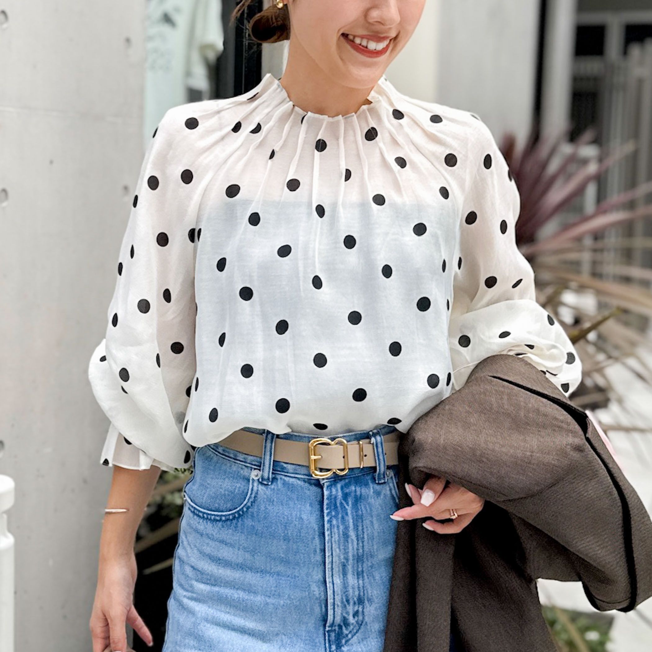 ◇25AW◇NOLLEYS◆Point・シアー感のある素材にドットプリントを施した素材で作ったデザインブラウス・衿ぐりにぐるっとピンタックで作ったフリルディテールを配して顔周りにポイント・袖口はシャーリングを使ったキャンディースリーブ・一枚で映えるので、シンプルなボトムス合わせがおすすめ●お取扱い上のご注意●末永くご愛用頂くために、アテンションタグを必ずご確認の上、着用又はお取り扱い下さい。気になる商品は、お気に入り登録がオススメです!クーポン情報、入荷情報が、通知されるようになります。※手洗い可※店頭及び屋外での撮影画像は、光の当たり具合で色味が違って見える場合があります。商品の色味は、スタジオ撮影の画像をご参照下さい。※商品画像に関しては出来る限り忠実に表示出来るよう努めておりますが、お客様がご利用のモニターの設定及び特性により、実際の商品と比較し色味に若干の誤差が生じる場合があります。※画像の商品はサンプルとなりますので実際の商品と仕様、加工、サイズが若干異なる場合がございます。