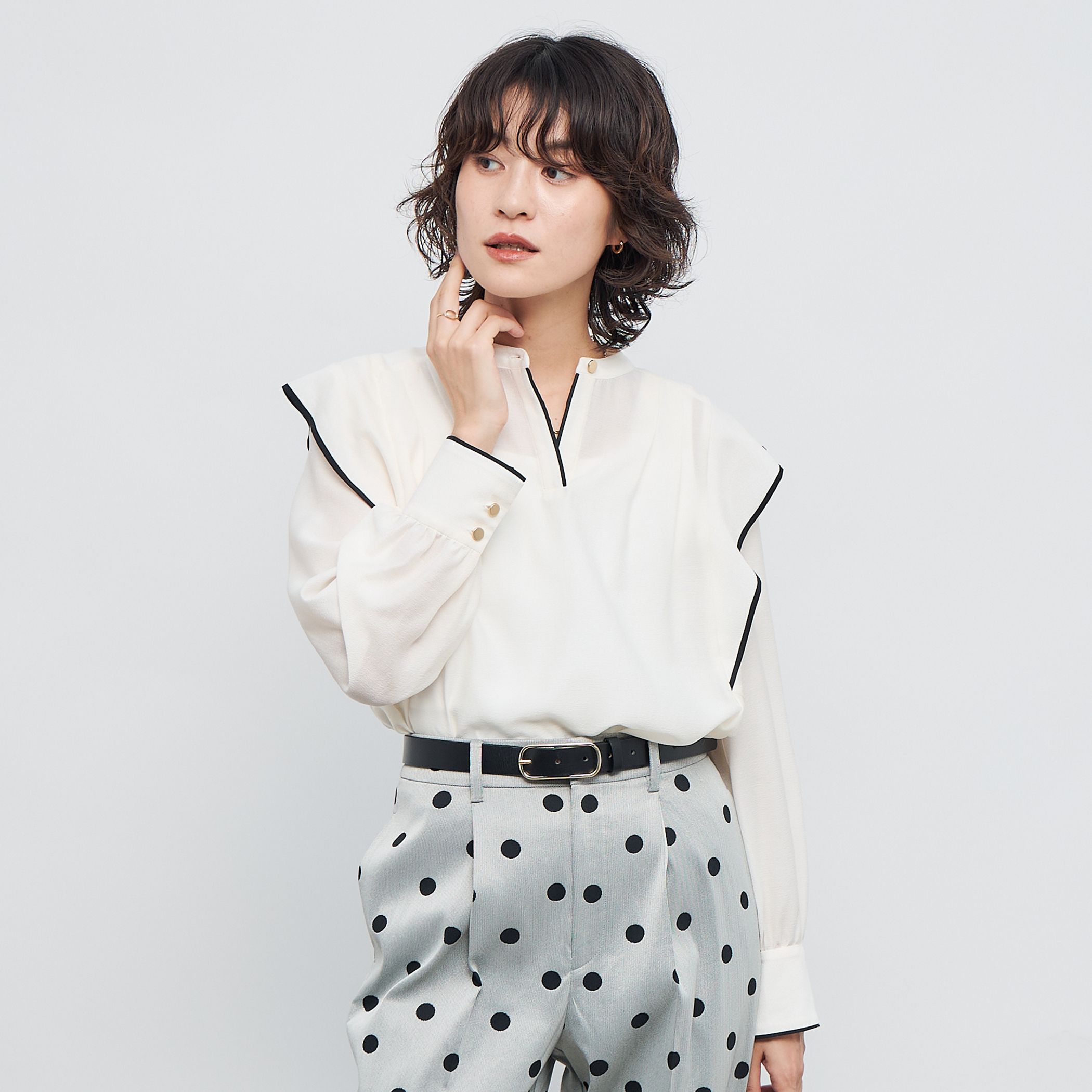 ◇25AW◇NOLLEYS ◆Point・表面感のあるシアー素材で作った一枚着ブラウス・前立て、ラッフル、袖口に配色パイピングを施し甘くなりすぎないデザイン・肩フリルデザインですが、薄い素材で、ジャケットやカーデのインナーとしても着用可能・テーパードパンツ合わせでオフィススタイルにも◎●お取扱い上のご注意●末永くご愛用頂くために、アテンションタグを必ずご確認の上、着用又はお取り扱い下さい。気になる商品は、お気に入り登録がオススメです!クーポン情報、入荷情報が、通知されるようになります。※手洗い可※店頭及び屋外での撮影画像は、光の当たり具合で色味が違って見える場合があります。商品の色味は、スタジオ撮影の画像をご参照下さい。※商品画像に関しては出来る限り忠実に表示出来るよう努めておりますが、お客様がご利用のモニターの設定及び特性により、実際の商品と比較し色味に若干の誤差が生じる場合があります。※画像の商品はサンプルとなりますので実際の商品と仕様、加工、サイズが若干異なる場合がございます。