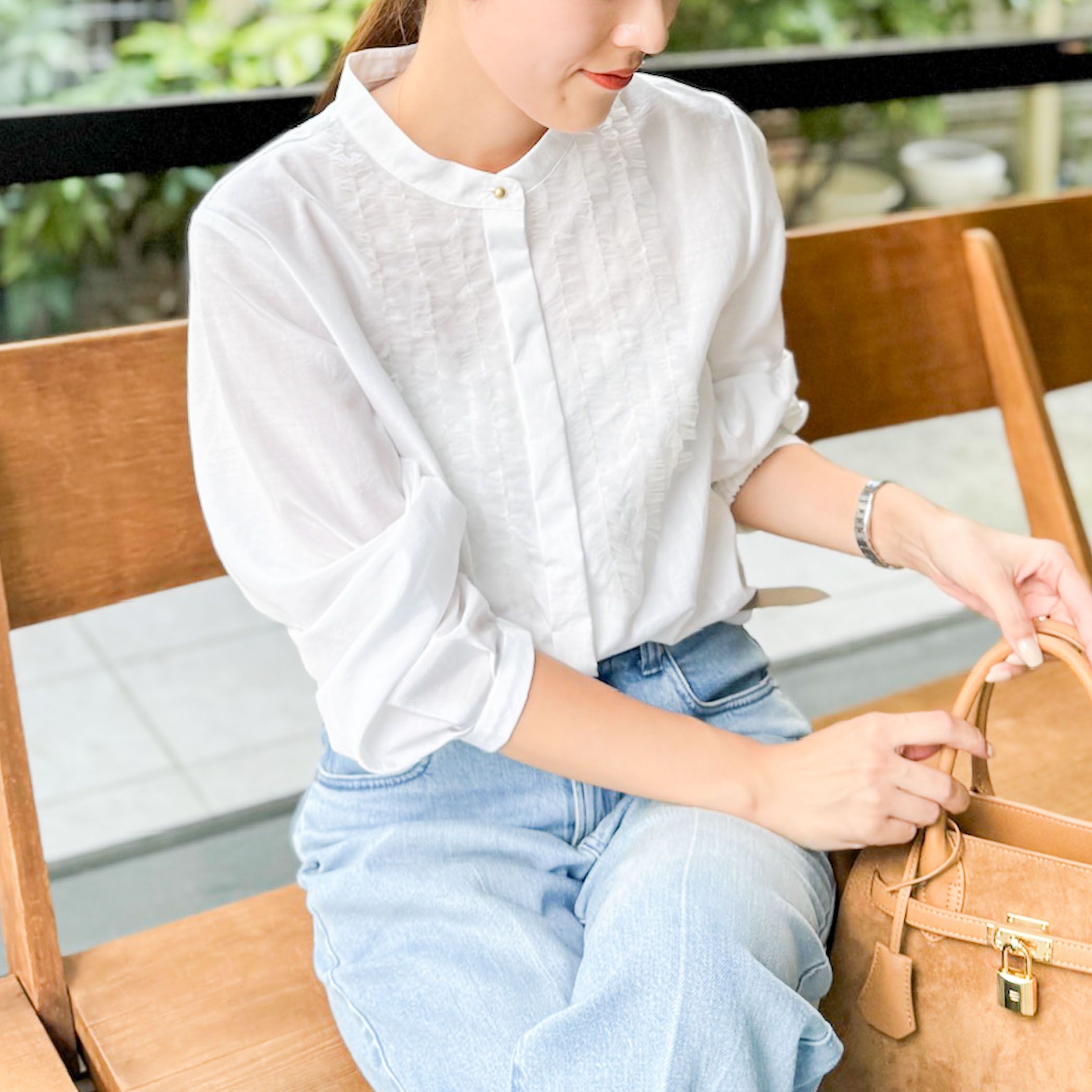 ◇25SS◇NOLLEYS◆Point・シンプルモダンなタックフリルブラウス・すっきりとした見頃にタックフリルとボリューム袖が好バランスな1枚・デニム合わせでデイリーカジュアルに・きれいめボトム合わせで上品華やかに着こなすのもおすすめ【MARILYN MOON/マリリーンムーン】デザイナーの中村法子氏によるファッションブランド。「 Daily dramatic 」「魅力的であり続けたい」と思うモダンでエレガントな女性に向けてかけがえのない「今」 「日常をドラマティックに」彩り、煌めきをあたえる服を提案。●お取扱い上のご注意●末永くご愛用頂くために、アテンションタグを必ずご確認の上、着用又はお取り扱い下さい。気になる商品は、お気に入り登録がオススメです!クーポン情報、入荷情報が、通知されるようになります。※手洗い可※店頭及び屋外での撮影画像は、光の当たり具合で色味が違って見える場合があります。商品の色味は、スタジオ撮影の画像をご参照下さい。※商品画像に関しては出来る限り忠実に表示出来るよう努めておりますが、お客様がご利用のモニターの設定及び特性により、実際の商品と比較し色味に若干の誤差が生じる場合があります。※画像の商品はサンプルとなりますので実際の商品と仕様、加工、サイズが若干異なる場合がございます。
