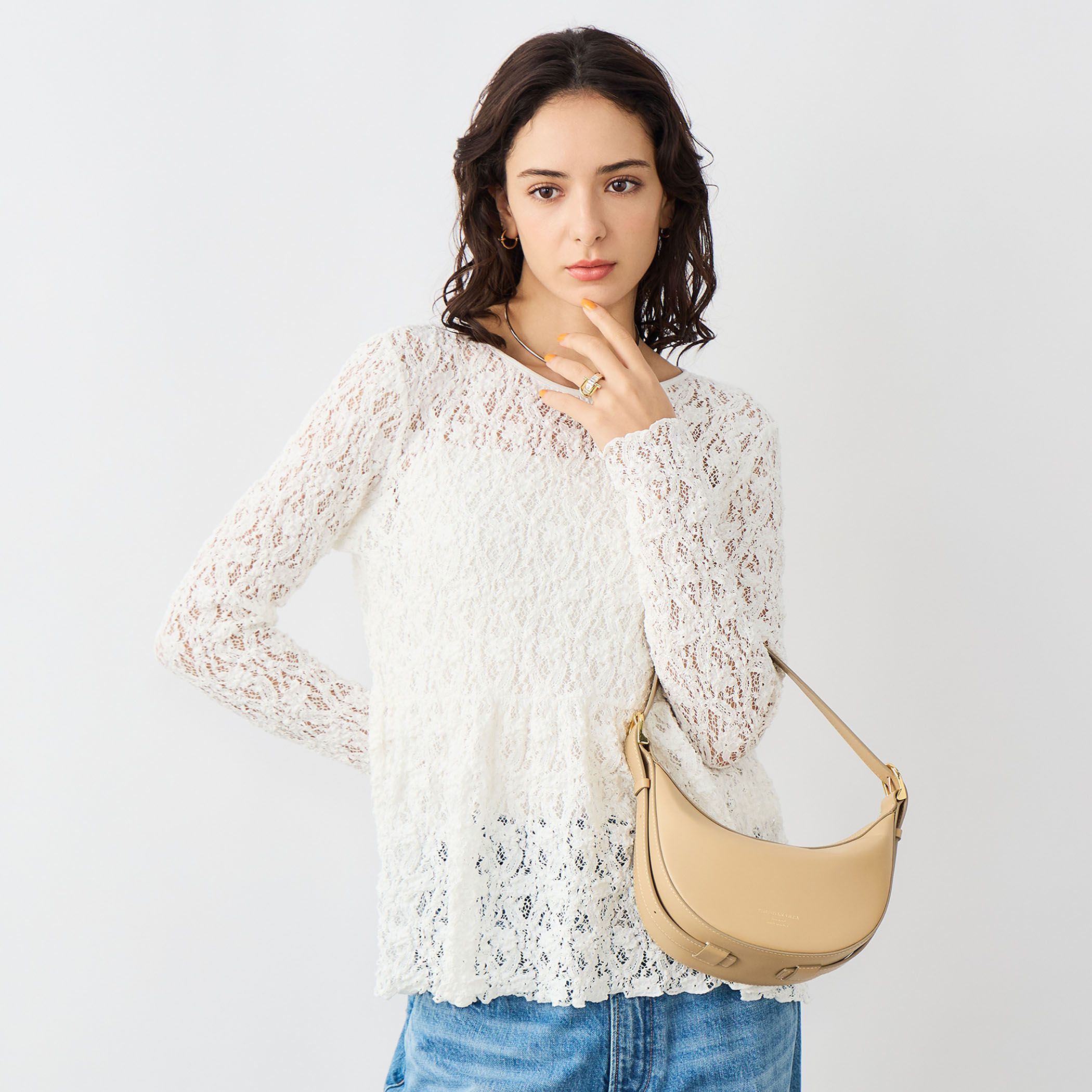 ◇25AW◇NOLLEYS sophi◆Point・繊細な柄表現に優れたジャガード機で編んだラッセルレースを使用したブラウス・やや太目のコード糸を使ったレースで繊細な柄でありながら凹凸感もある素材感・素材の伸縮性を生かし、ロンT感覚で着用できるカットソーの仕立て・1枚ではもちろん、ニットやジャケットなどのインナーにもおすすめ 今年らしい新鮮なレイヤードスタイルを楽しんで頂けるアイテム・カジュアルにもパーティなど華やかなシーンにも〇※生地の特性上、寸法に個体差がございます。●お取扱い上のご注意●末永くご愛用頂くために、アテンションタグを必ずご確認の上、着用又はお取り扱い下さい。気になる商品は、お気に入り登録がオススメです!クーポン情報、入荷情報が、通知されるようになります。※手洗い可※店頭及び屋外での撮影画像は、光の当たり具合で色味が違って見える場合があります。商品の色味は、スタジオ撮影の画像をご参照下さい。※商品画像に関しては出来る限り忠実に表示出来るよう努めておりますが、お客様がご利用のモニターの設定及び特性により、実際の商品と比較し色味に若干の誤差が生じる場合があります。※画像の商品はサンプルとなりますので実際の商品と仕様、加工、サイズが若干異なる場合がございます。