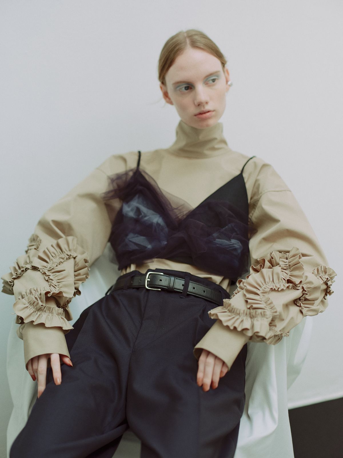 曲線のフリルギャザーが映える、袖コンシャスな一枚。フロントは立ち襟ですっきりとさせ、脇下の切り替えは着るだけで立体感を実現。ネックラインのリボンは自由に結んだり垂らしたり、結び位置でも印象が変わり、より上級スタイルを満喫できそう。