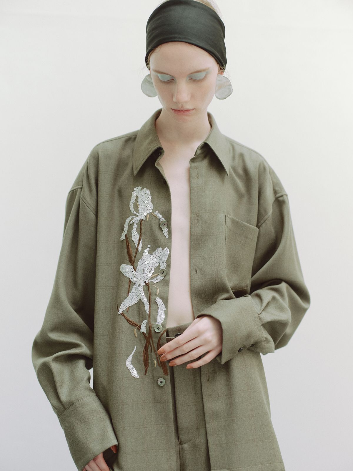 渋めの格子柄に、スパンコールや刺繍でボタニカルを表現したオーバーシャツ。適度にハリのあるウール生地で品よくまとまり、どこかクラシカルな佇まいが旬度をアップ。大きめのシェルボタンやシャープな襟もさりげなくメリハリを与えています。