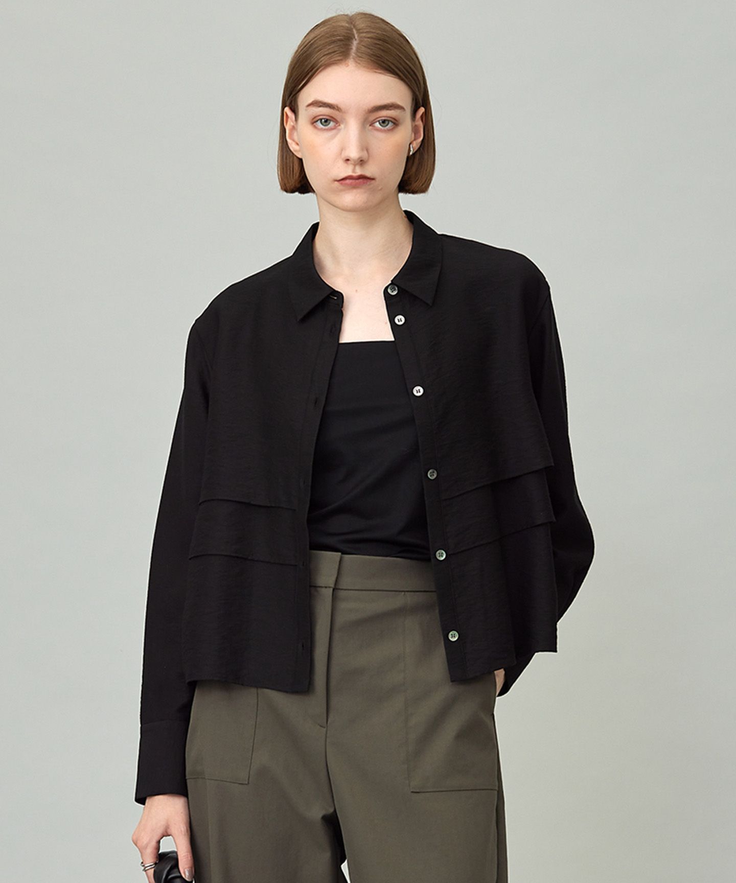 2025SS一枚で旬な雰囲気と洒落感が手に入るクロップドブラウス■デザインクロップドレングスにレイヤードディテールを加えたトレンド感のあるブラウスです。シンプルかつオシャレポイントの詰まった一枚で、カジュアルにもマニッシュにも着こなせます。ワイドパンツやボリューム感のあるボトムスと合わせるのもおすすめで、今までと違った印象のコーディネートを楽しめます。■素材毛羽立ちが少なく、クリアな表情が特徴のブロード素材を使用しています。通常のT/Rよりもきれいな仕上がりで、ピリングも少なく、イージーケア性のある素材に仕上げています。※商品の取り扱い方法につきましては、タグ等に記載されている「取り扱い上の注意」「洗濯表示」をご確認ください。※採寸情報はサンプル商品のデータです。実際の商品と仕様が異なる場合がございます。※商品画像はサンプルを使用しているため、実際にお届けする商品と色味やサイズなどの仕様に変更がある場合がございます。予めご了承ください。
