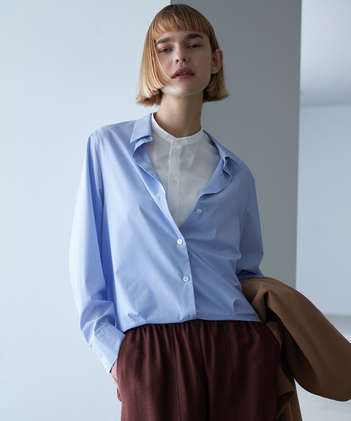 2025AW1着でレイヤード見えが完成クリーンでこなれた印象のデザインシャツ■デザインバンドカラーのシャツの上からシャツを重ねているような1枚でこなれ感の出るレイヤード風デザインシャツです。中のバンドカラーシャツはノースリーブにし、気温の高い時期にも暑苦しくない仕様となっています。上のシャツと裾で縫い止めてある前開きタイプなので、ラクに着用が出来ます。上のシャツの襟を少し抜いて緩めに着ていただくのもおすすめです。■素材毛羽立ちが少なく、クリアな表情が特徴のブロード素材を使用しています。ピリングにもなりにくく、イージーケア性のある素材に仕上げています。※商品の取り扱い方法につきましては、タグ等に記載されている「取り扱い上の注意」「洗濯表示」をご確認ください。※採寸情報はサンプル商品のデータです。実際の商品と仕様が異なる場合がございます。※商品画像はサンプルを使用しているため、実際にお届けする商品と色味やサイズなどの仕様に変更がある場合がございます。予めご了承ください。