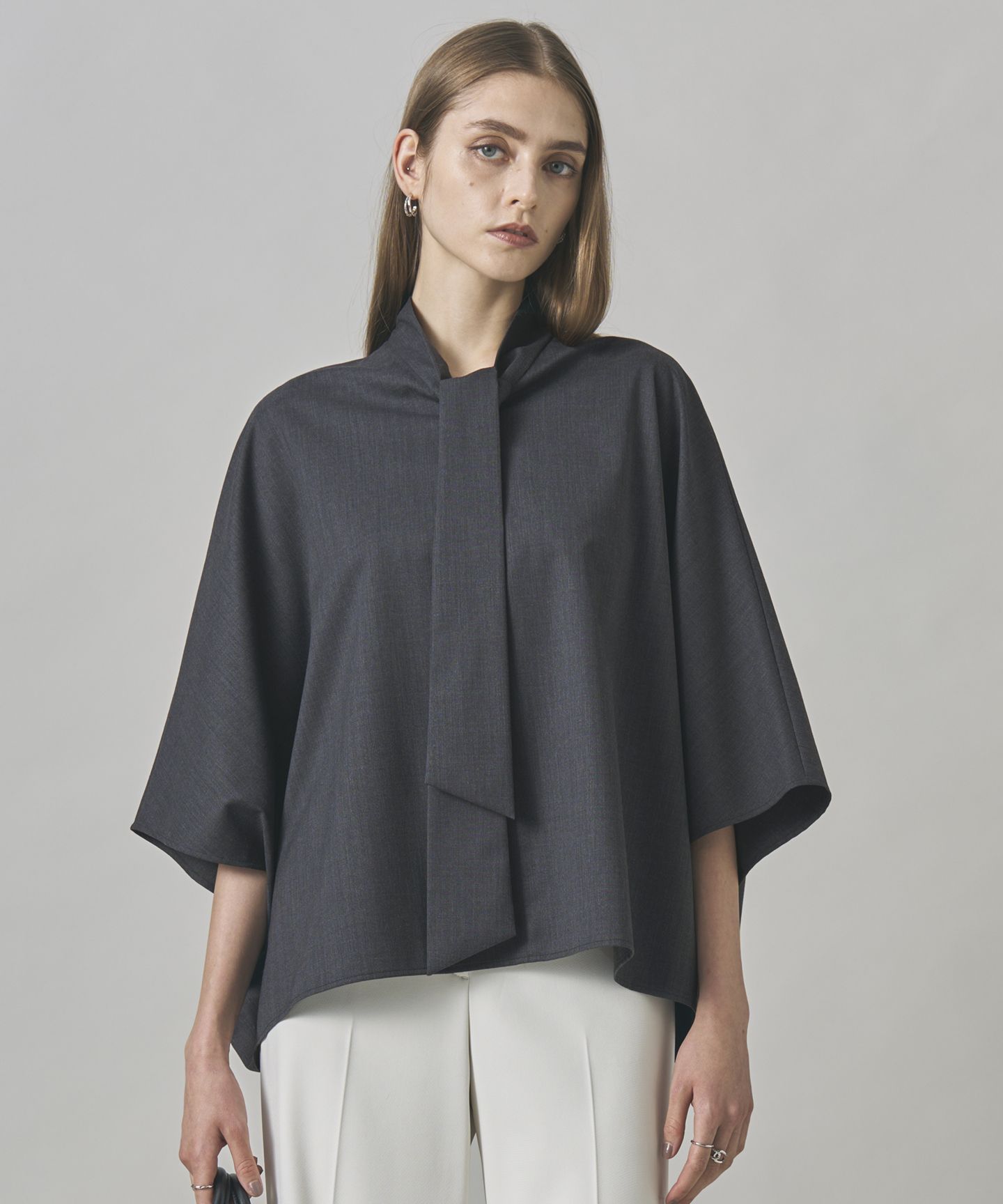 2025AW程よい光沢感のある上質素材と上品ボウタイが魅力のクロップドブラウス■デザインボリューム感のある今シーズンらしいシルエットが目を惹くクロップド丈ブラウスです。ボウタイディテールがポイントで単品使いはもちろん、同シリーズのパンツやスカートとのセットアップでのスタイリングもおすすめです。■素材ウールとポリエステルのコンパクトな表情がポイントのブロード素材です。程良い光沢感と滑らかなタッチが特徴で、伸縮性のあるポリエステルを使用している為、ストレッチ性がありシワになりにくく、快適な着心地が魅力です。※商品の取り扱い方法につきましては、タグ等に記載されている「取り扱い上の注意」「洗濯表示」をご確認ください。※採寸情報はサンプル商品のデータです。実際の商品と仕様が異なる場合がございます。※商品画像はサンプルを使用しているため、実際にお届けする商品と色味やサイズなどの仕様に変更がある場合がございます。予めご了承ください。