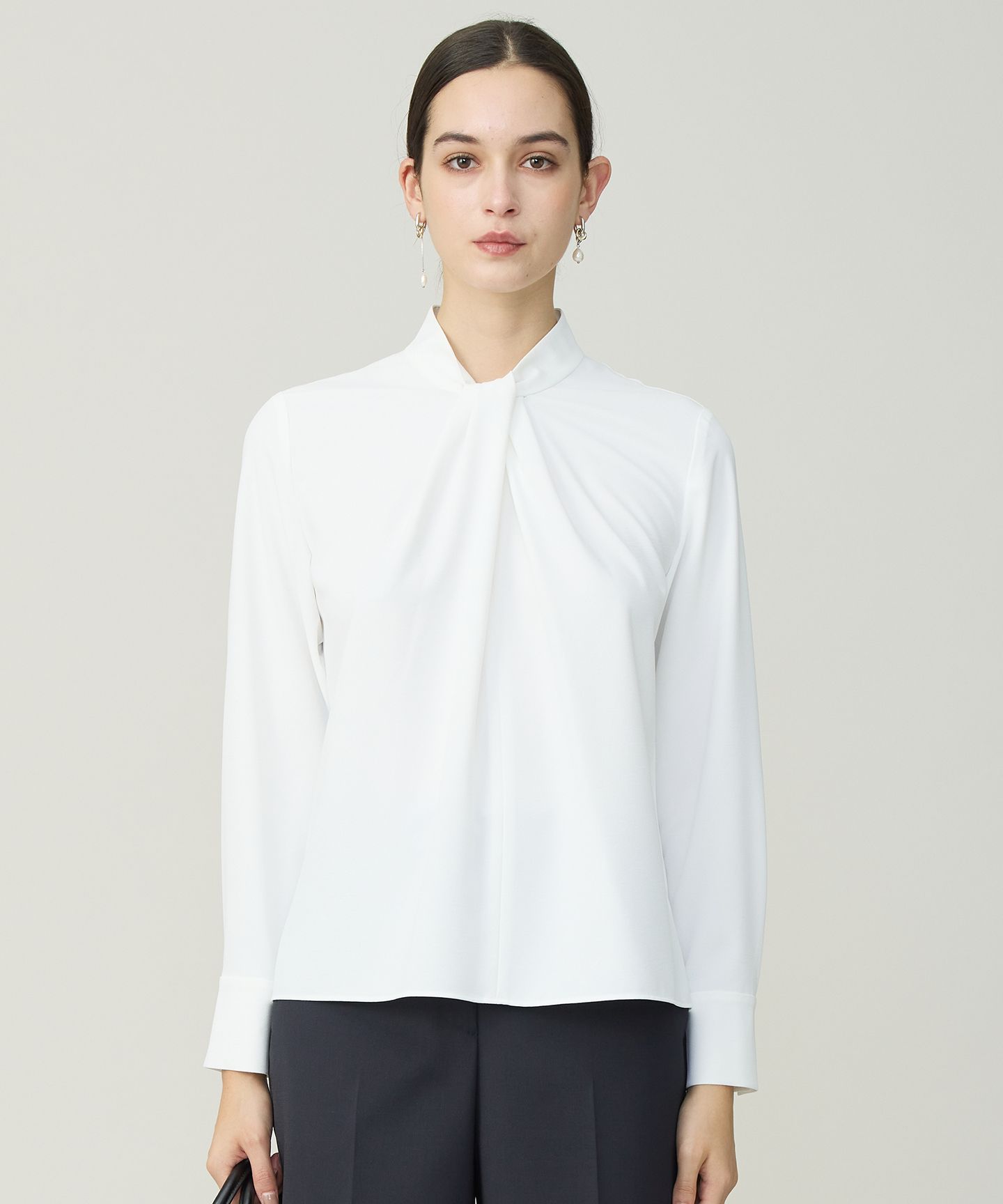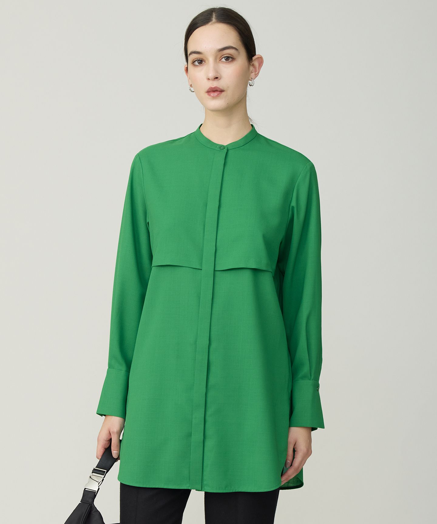 2025AW洗練されたデザインとイージーケア素材で旬の冬コーデを叶えるバンドカラーブラウス■デザインフライヨークデザインがポイントのチュニック丈のバンドカラーブラウスです。前立ては比翼仕立て、すっきりとしたカフスデザイン、裾のシャツテールで体型カバーも叶います。一枚でも羽織でもサマになるデザインと今年らしいカラーで着映え間違いなし。ワイドパンツにもスティックパンツにも合わせやすく、きちんと感もあるためON/OFF活躍します。■素材上質なウールと極細のポリエステルフィラメント使用したツイル素材を使用しています。強撚したサイロフィル糸の為、毛羽が少なく、適度にドライタッチで、シアーな表情と軽さもポイントです。ウールとポリエステルを組み合わせている為、手洗い可能でシワになりにくいイージーケア素材です。※商品の取り扱い方法につきましては、タグ等に記載されている「取り扱い上の注意」「洗濯表示」をご確認ください。※採寸情報はサンプル商品のデータです。実際の商品と仕様が異なる場合がございます。※商品画像はサンプルを使用しているため、実際にお届けする商品と色味やサイズなどの仕様に変更がある場合がございます。予めご了承ください。