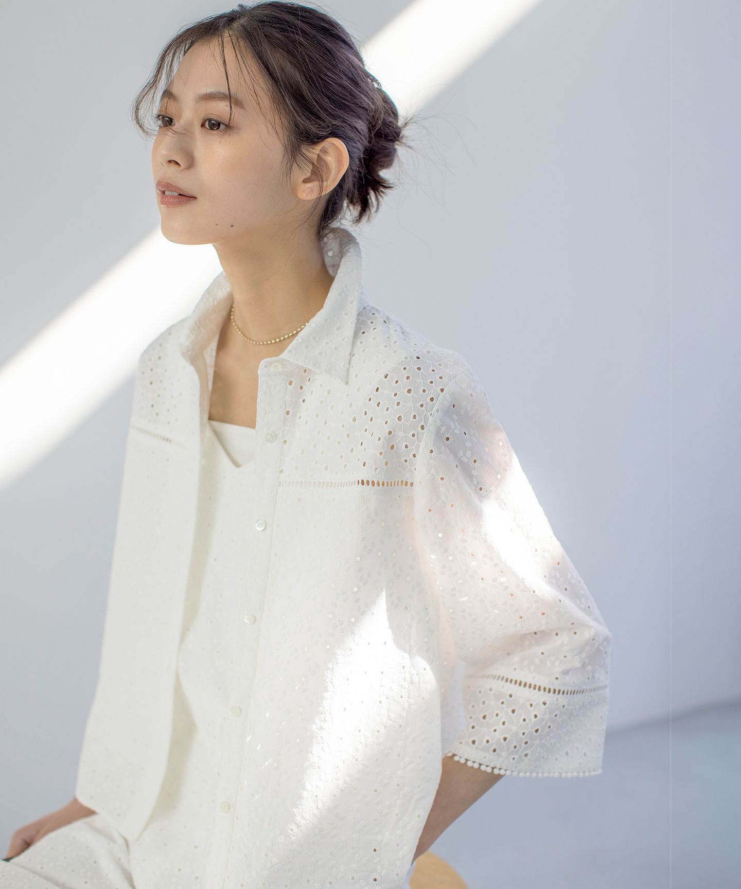 柄の異なる刺繍生地が大人の日常を華やかに彩るデザインブラウス■デザインシャツカラーの7分袖のシャツブラスは羽織りにも使用でき長いシーズン着用をお楽しみいただけます。身頃と袖はフラワーモチーフ、襟、ヨーク、カフス部分に幾何柄を組み合わせました。また、柄切り替え部分の繋ぎにハシゴレースを使用し高級感を出しています。釦は貝釦を使用。前をきっちり留めてきれいめにも、Tシャツに羽織ってカジュアルなスタイリングもおススメです。■素材レースの持つ程よい抜け感が魅力の素材です。刺繍生地は程よい厚みの基布を使用しているため表面が綺麗でカジュアルになり過ぎないのも特徴。立体感が出るよう針数を増やして刺繍しました。コットンローンにフラワーモチーフと幾何柄を使って表現した組曲オリジナル柄に、2種類のアイレット刺繍で特別感のある商品に仕上げています。※撮影時の照明の関係により、色味が若干異なって見える場合がございます。実際にお届けする商品の色味はハンガー吊り画像をご参照ください。※画像はサンプルを使用しているため、実際にお届けする商品と色味やサイズ等の使用に変更がある場合がございます。予めご了承ください。【お買い物をより楽しんで頂くために】▼商品のお気に入り登録ハートマークをクリックし、お好きなカラーを選んでお気に入りに登録が完了!完売カラーの再入荷通知や、ラスト1点の通知、セールの通知も受け取ることができます。▼ブランドのお気に入り登録新商品や再入荷等、いち早くブランドのお得な情報を受け取ることができます。