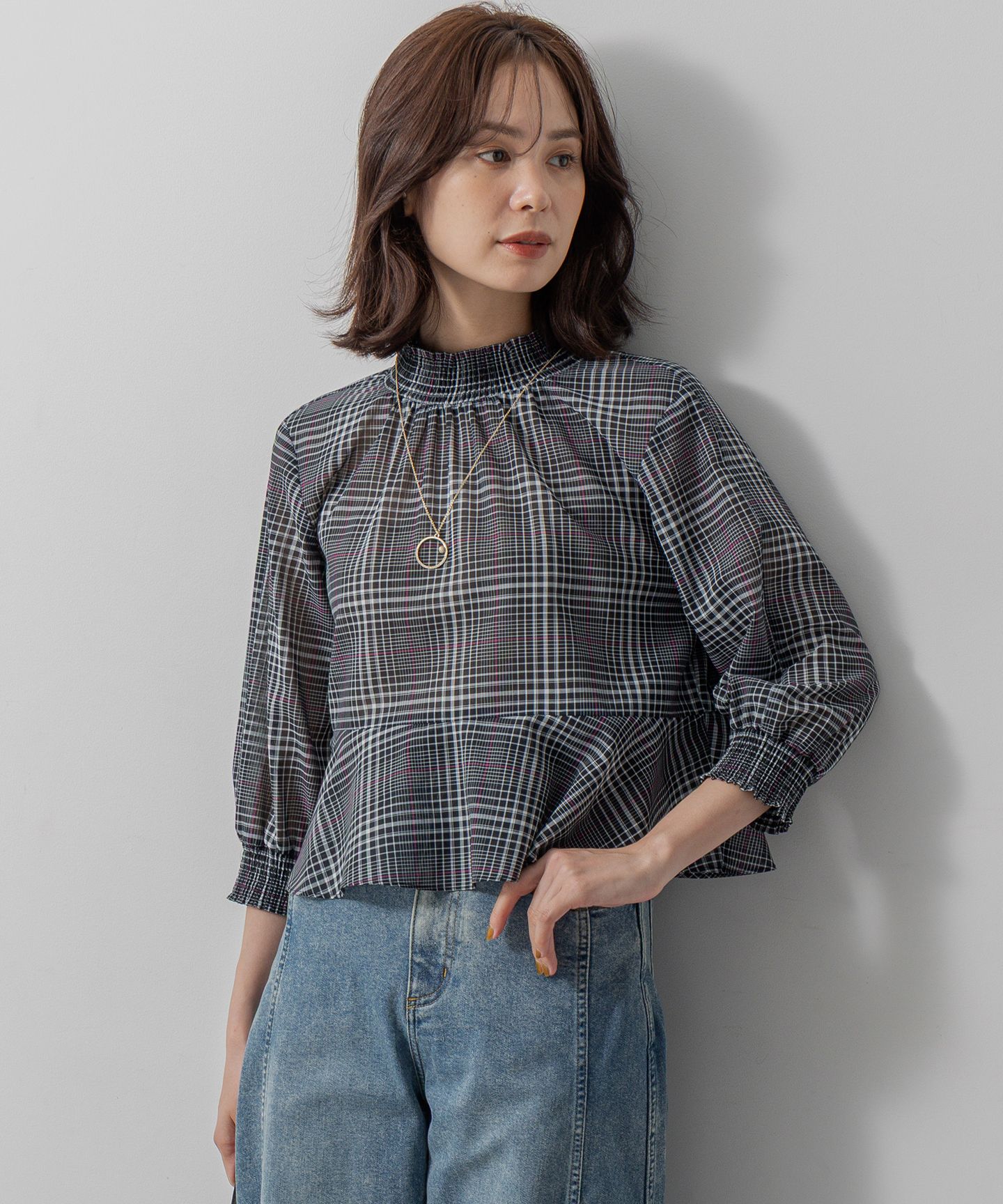 2WAY仕様×オリジナルチェック柄の1枚でサマになるティアードブラウス■デザイン・ハイネックと袖カフスはデザイン性と伸びる機能を兼ね備えたモッキング仕様。1枚でもサマになる裾フレアティアードブラウス。・2WAY仕様。裾のフレアティアードはアウトしてチュニック風でパンツスタイルにオススメ。フレアをインしてクロップド丈のバランスでも楽しめます。・袖の前アームホールはセットインでスッキリ、後ろはラグランで動きやすく。7分袖で初秋のまだ暑い日でも即着可能でスモッキングの機能でブラウジングしてボリューム感を出しても◎。■素材・細番手のポリエステルでドライでナチュラルタッチな梳毛調の素材感を再現した組曲オリジナルのアソート先染めチェック素材。・程よいシアー感と軽さとイージーケアーが魅力の素材です。・優しいソフトタッチも兼ね備えています。【スタッフコメント】▼身長158cm|着用サイズ2 (通常着用サイズM)裾の2段目フリルをイン・アウト可能な2WAY仕様なので、様々なスタイリングに合わせていただきやすい1着。7分袖なのでまだまだ暑い初秋でもサラッと着ていただける優れものです。============================洗濯方法:マシンウォッシャブル裏地:なし============================【注意事項】※撮影時の照明の関係により、色味が若干異なって見える場合がございます。商品の色味はハンガー吊り画像をご参照ください。※画像はサンプルを使用しているため、実際にお届けする商品と色味やサイズ等の仕様に変更がある場合がございます。▼気になるアイテムは『お気に入り登録』がおすすめ▼お好きなカラー&サイズを選んで?マークをクリック!再入荷通知や、ラスト1点の通知、セールの通知も受け取ることができます。