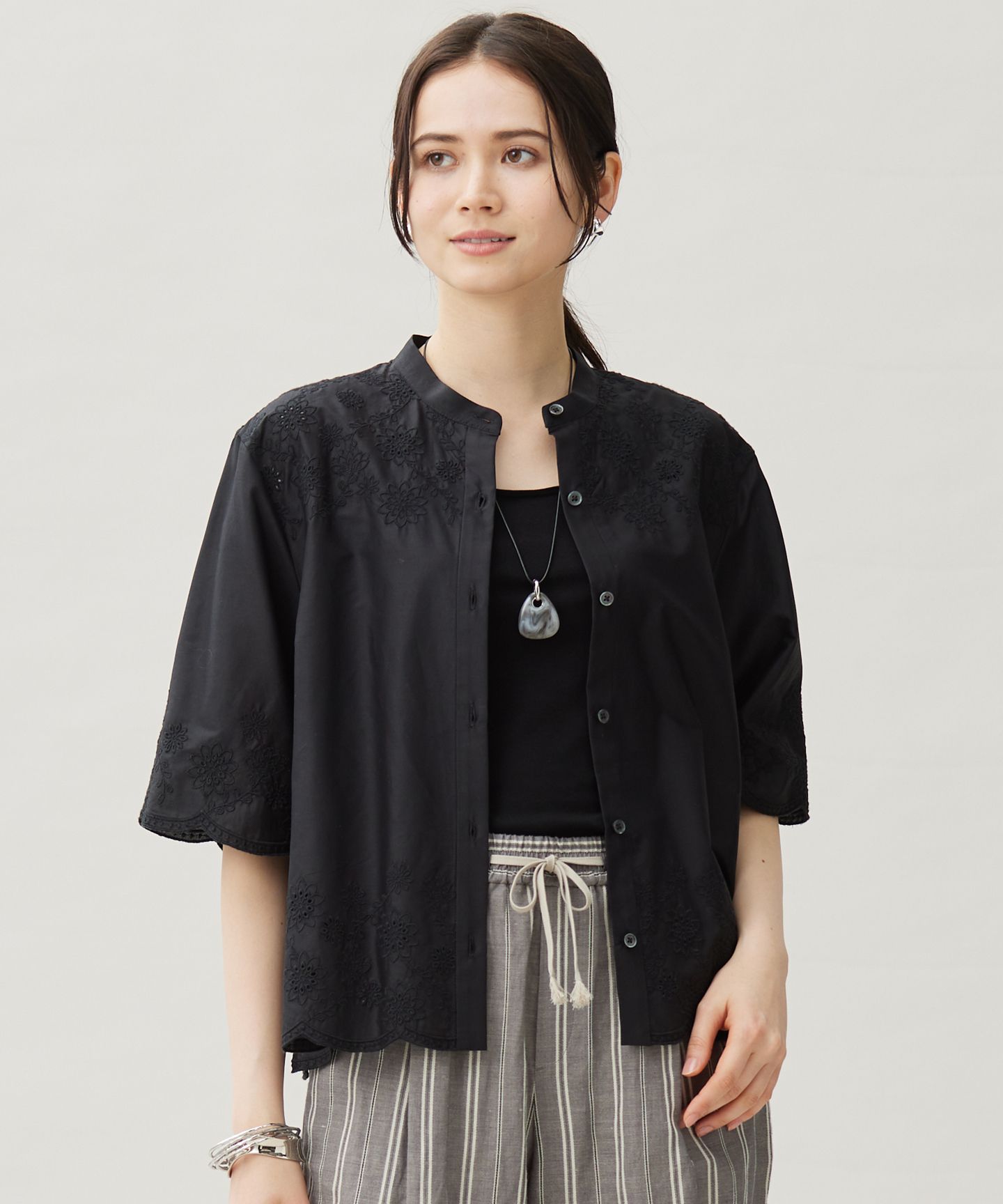 フラワーモチーフの刺繍が華やかな、羽織りにもなるシャツブラウス■デザイン裾と袖口にスカラップを施し、たっぷりと刺繍を入れたシャツブラウスです。ゆとりのあるシルエットと太めの袖、トレンドのクロップド丈がポイントです。ワイドパンツなどボリュームのあるボトムに合わせると今年らしいバランスのコーディネートが完成します。前を開けて羽織りとしても着て頂けます。ロンドンにある花屋Matsurika Flowers(マツリカフラワー)とのコラボレーションアイテムです。【Matsurika Flowers】ロンドンを拠点に活動する日本人フローラルデザイナーMariko KinoshitaさんによるMatsurika Flowers。花が持つナチュラルな美しさを生かし、世界の歴史やカルチャーを着想源に、ビンテージとアンティークを組み合わせたスタイルが人気です。ウェディングやイベントでフラワーアレンジメントを手がけるほか、ワークショップも開催しています。■素材セルロース系再生繊維とコットンを使用したナチュラル感がありながらもカジュアル過ぎない、適度なハリ感と滑らかな肌触りが特徴の素材です。さらりとしたタッチが蒸し暑い時期にも着て頂きやすく、接触冷感機能付きで清涼感を感じられる暑い夏にもおすすめの素材です。刺繍に取り入れたモチーフは、ダリアやジニアなど夏に咲く花を抽象的に描いています。上質な生地を傷つけないよう繊細なテクニックを用い、たっぷりと糸数を使用しカットワークも施した、デザイン性の高さとテクニックの繊細さが光る刺繍素材です。■同素材アイテムTブラウス(BLWRGA0004)プルオーバーブラウス(BLWRGA6701)スカート(SKWRGA0003)シャツワンピース(OPWRGA0003)※画像はサンプルを使用している為、実際にお届けする商品と仕様、加工、サイズが若干異なる場合がございます。予めご了承ください。※撮影環境の都合上、実際の商品と色味が異なって見える場合がございます。