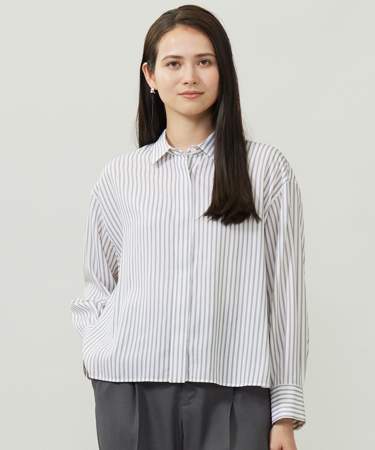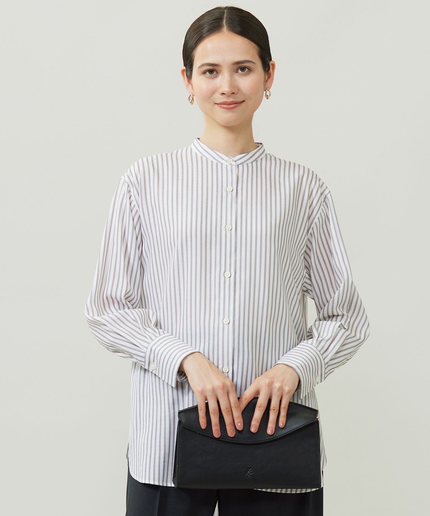 1枚着としてもインナーとしても着て頂けるバンドカラーブラウス■デザイン肩幅と身頃に程よくゆとりを持たせた、シンプルなバンドカラーのブラウスです。しなやかな素材の落ち感と相まって大人っぽい抜け感を感じられるブラウスに仕上げました。袖の短冊には、自由区ロゴの刺繍を施しております。カフスの釦は可変仕様になっており、袖をたくし上げてパフスリーブのようにして着て頂けるのも嬉しいポイントです。1枚着としてはもちろん、コンパクトなバンドカラーなので、ニットのインナーにしてもバランスよく着て頂けます。 ■素材ポルトガルのSOMELOS社で織り上げた、セルロース系再生繊維100%のブラウス素材です。ストライプは自由区別注柄です。丁寧に織り上げられ、しなやかさ、ドレープ感、程よいハリ感の全てがバランス良く計算しつくされた仕上がりとなっております。ソフトな風合いで肌触りが柔らかく、シルクのような光沢感、清涼感があるため暑い夏でも着心地の良い素材です。■同素材アイテムドルマンスリーブブラウス(BLWRGW0310)※画像はサンプルを使用している為、実際にお届けする商品と仕様、加工、サイズが若干異なる場合がございます。予めご了承ください。※撮影環境の都合上、実際の商品と色味が異なって見える場合がございます。