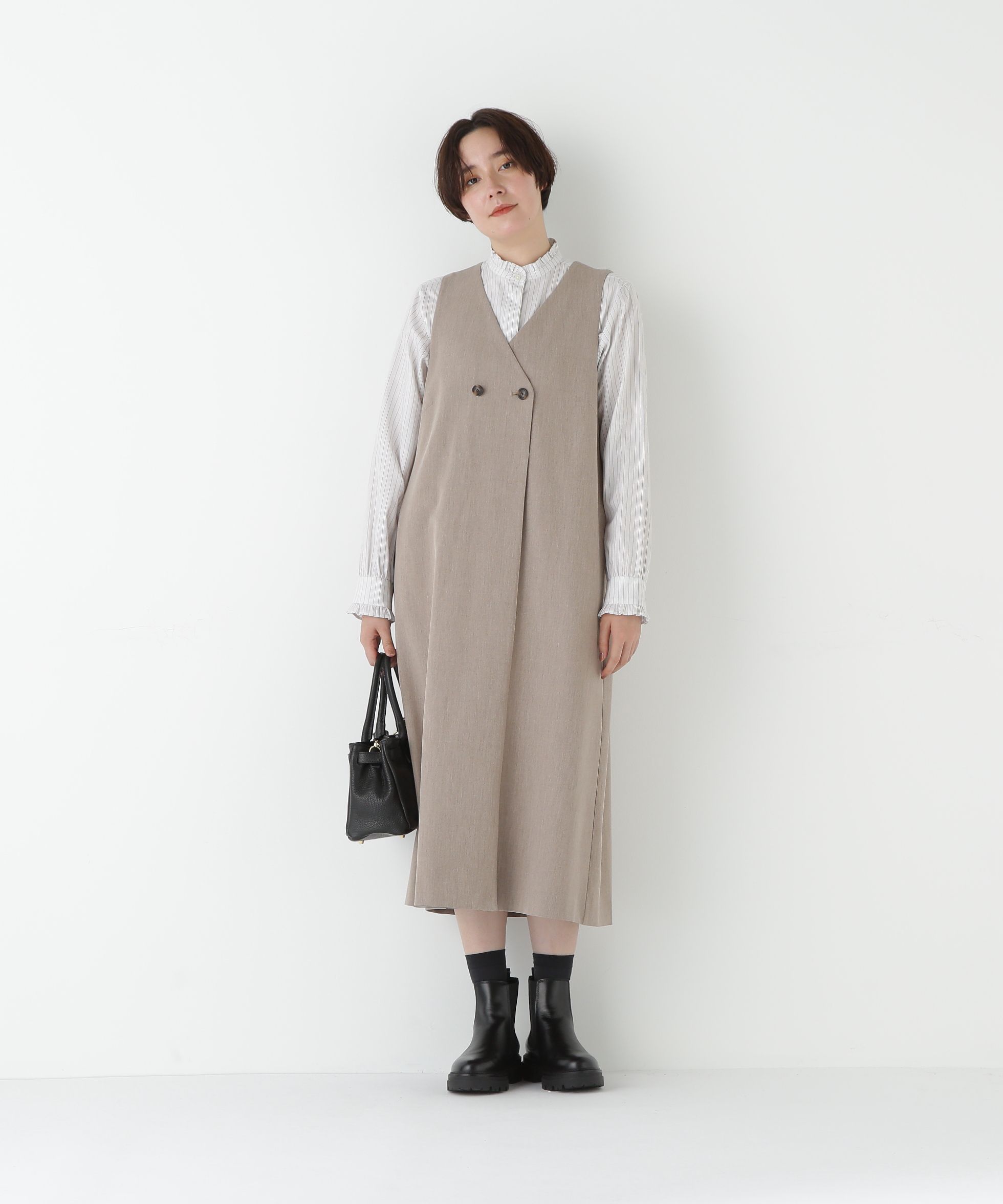 クラシカルで上品な大人のジャンパースカート【デザインのポイント】ダブルボタンがポイントのVネックのノースリーブワンピースです。前のボタンの開け閉めで着脱できます。後ろ中心のタックデザインもポイントです。【素材のポイント】2wayストレッチのT/Rストレッチ素材を使用。体に馴染む生地感です。【おすすめコーディネート】スタンドフリルのブラウス合わせでクラシカルなスタイルや、シャツ合わせのプレッピーなスタイルもおすすめです。シンプルなニットやカットソーと合わせてもお出掛けスタイルが決まる大人のジャンパースカートです。透け感/なし|裏地/あり|光沢/なし|生地の厚さ/普通|伸縮性/ややあり|シルエット/スタンダード