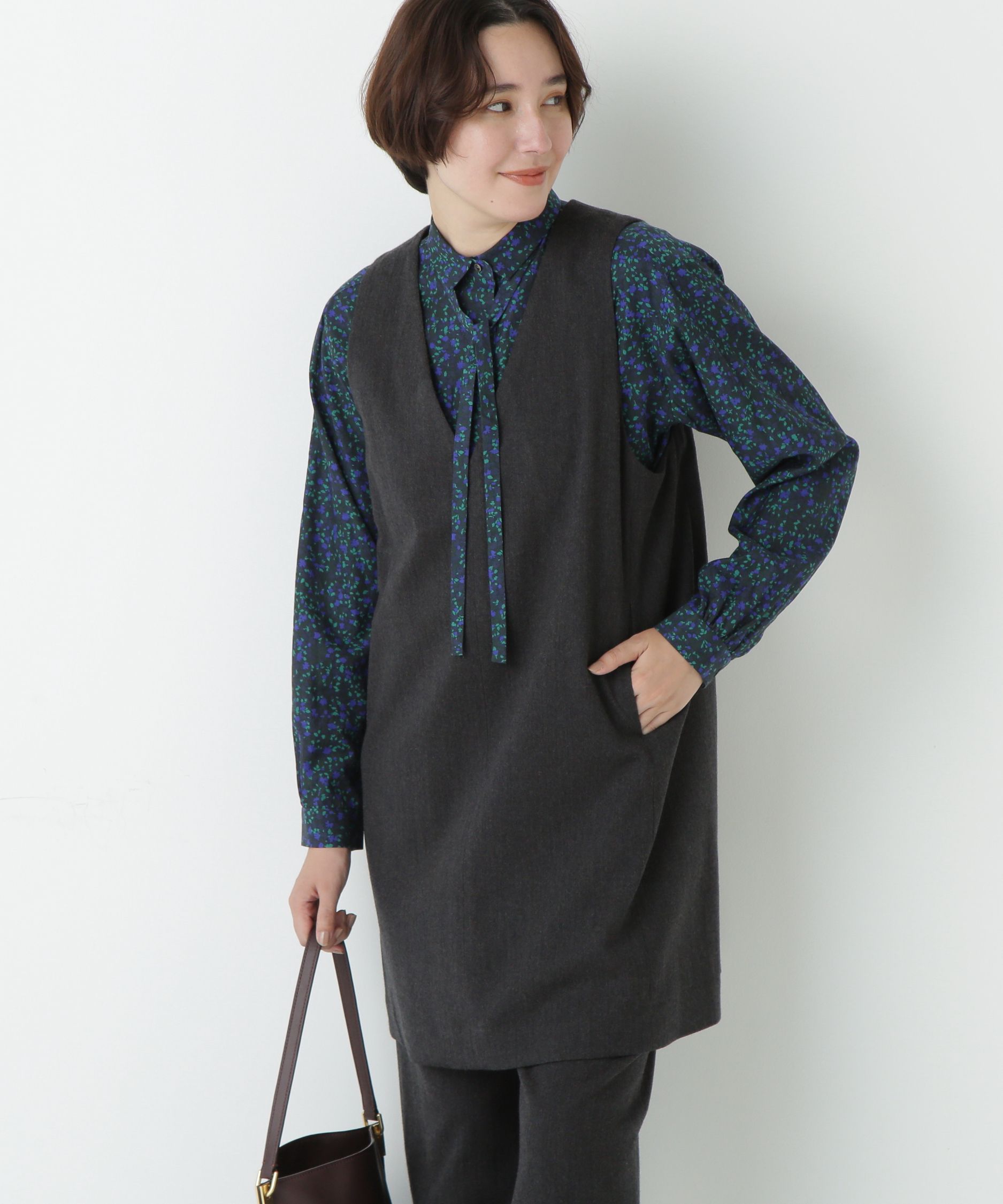 鮮度あるレイヤードスタイルを楽しめるミディアムジャンパースカート【デザインのポイント】シンプルなV開きミディアムレングスのジャンパースカートです。【素材のポイント】human woman定番のTOPツイルストレッチを使用しています。雰囲気あるツィード見えにも関わらず、表面感がスッキリしていて軽いのも特徴です。【おすすめコーディネート】チュニックのようにニットプルオーバーやブラウスに合わせて新しいバランスのレイヤードを楽しめます。同素材のガウチョパンツとのセットアップもおすすめです。透け感/なし|裏地/あり|光沢/なし|生地の厚さ/普通|伸縮性/なし|シルエット/スタンダード