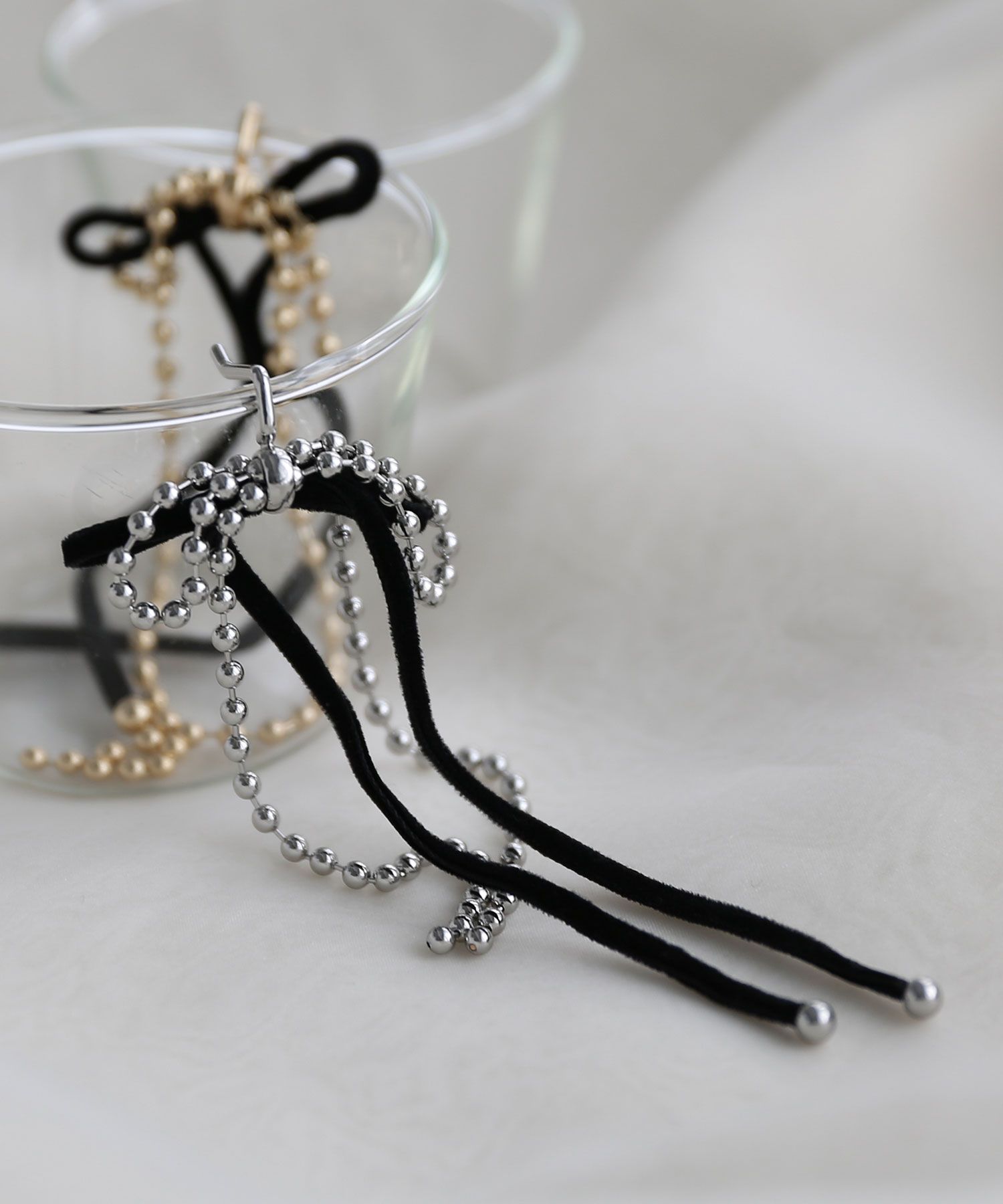 細いベロアリボンとボールチェーンを重ねたリボンデザインのヘアカフ/ヘアフック。やや長めで揺れ感があり、動きのあるヘアスタイルに。さっと結んだ髪に挿し込むだけなのでアレンジが苦手な方にもおすすめ。普段使いにはもちろん、オケージョンスタイルやオフィスコーデとも好相性なアイテムです。【pick up points】・ベロア×チェーンの甘さのない大人デザイン・チェーンならではの揺れ感・髪の結び目に挿し込むだけのヘアフック・ヘアカフタイプ。アレンジが苦手な方にもおすすめ*注意事項撮影場所やイメージにより実際の商品と色味が若干異なる場合がございます。商品のお色味はカラーバリエーション画像をご参照ください。