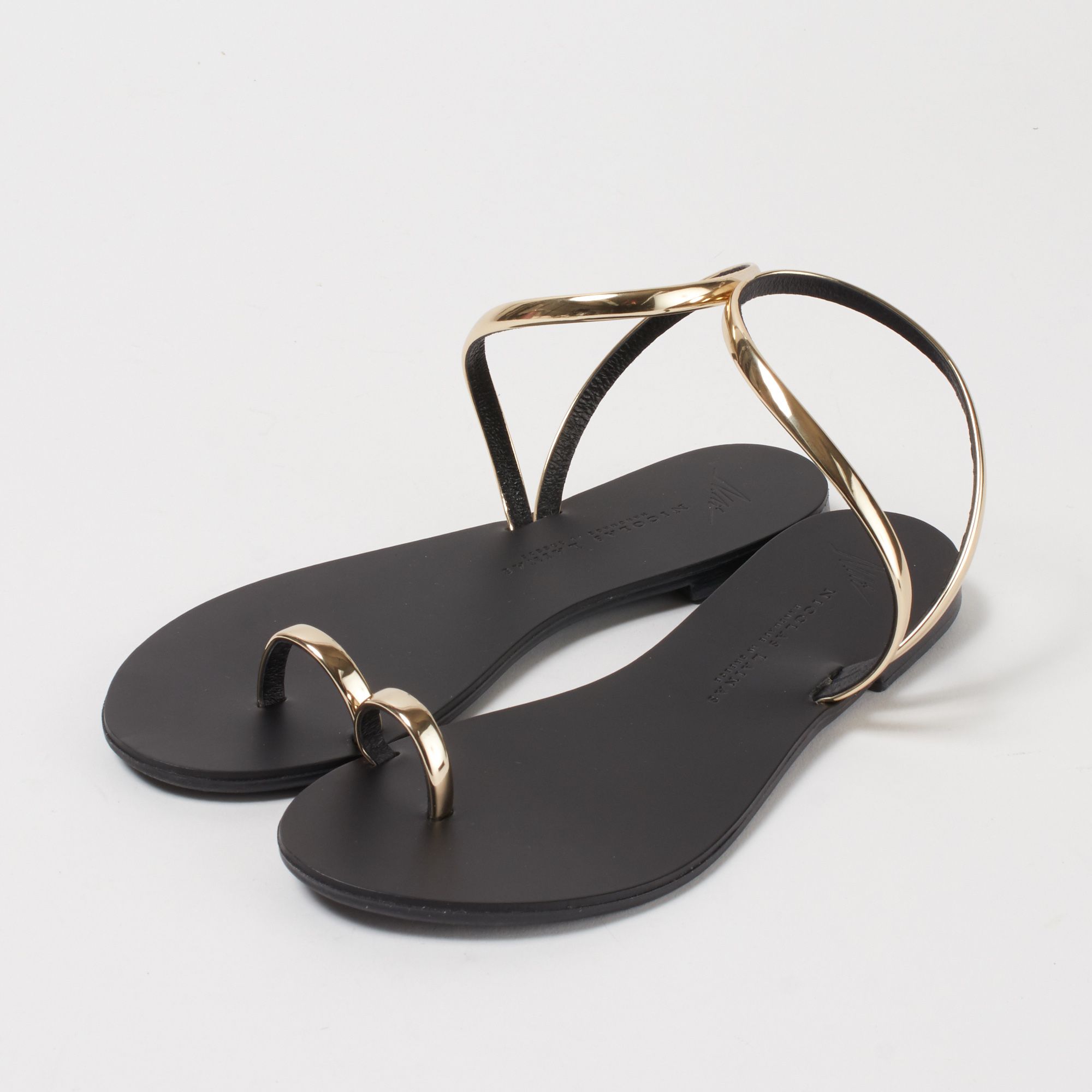 ゴールド×ブラックを組み合わせた、夏らしいヌーディサンダル。細いストラップに足首と親指を通して履く軽やかなデザインが、足元に洗練された色香と抜け感をもたらします。カジュアルなパンツにも女性らしいワンピースにも合わせやすく、街でもリゾートでも大活躍。ゴールドの上品なきらめきで、毎日コーデにワンランク上のスパイスを投入して。