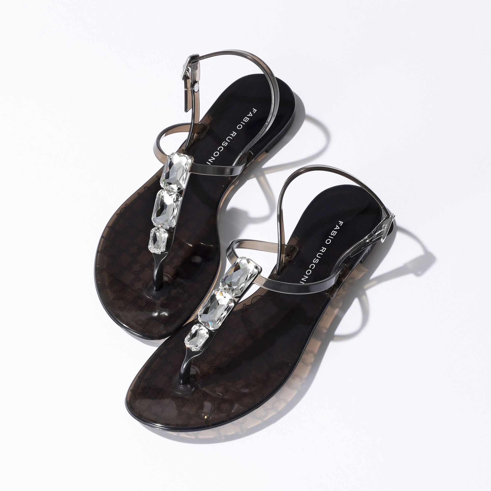 履くだけで夏気分になれる、PVC素材のトングサンダル。大ぶりのビジューがカジュアルなサンダルに華やかな表情をプラス。デニムにもドレスにも合う万能な一足。