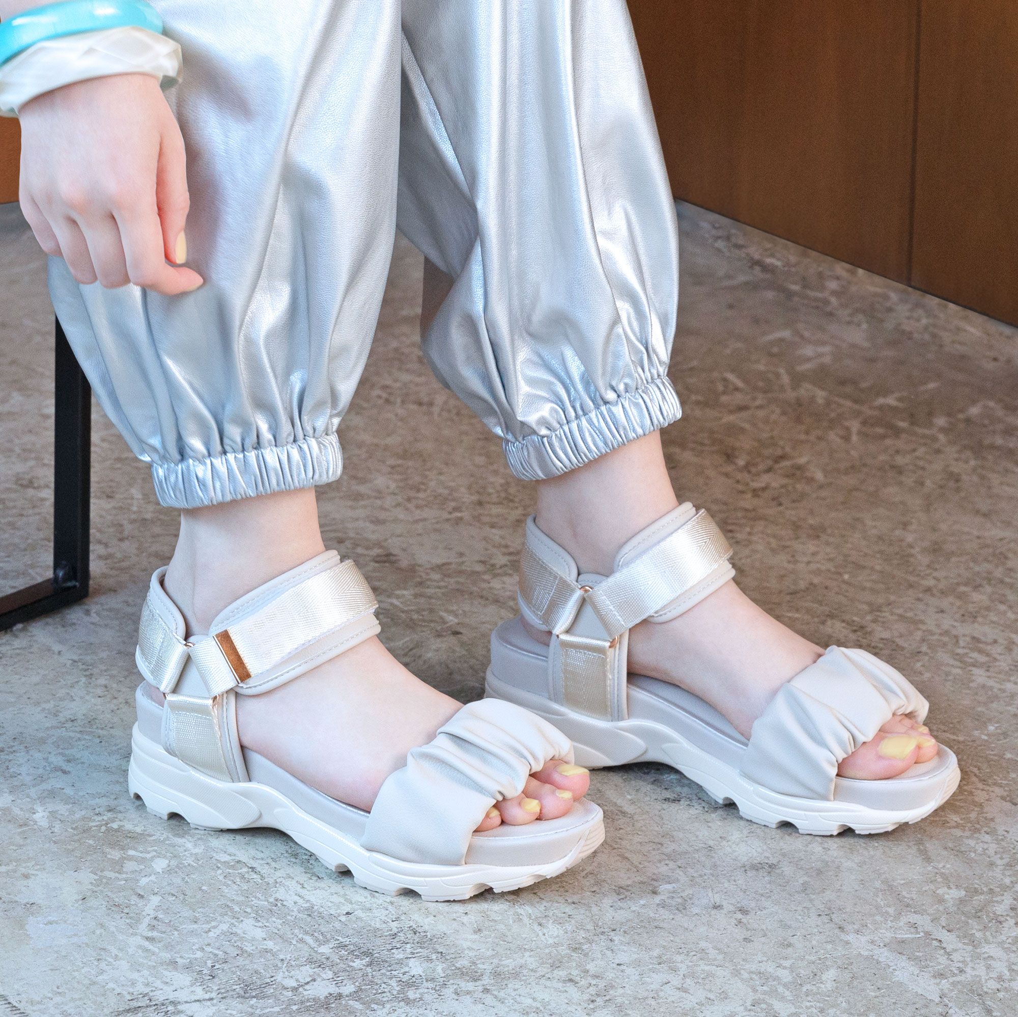 甘さとカジュアル感の調和が取れたサンダルに仕上げました。大人愛らしいギャザーデザインと軽量のスニーカーソールで程よい甘さのシティ向けスニーカーサンダルです。ギャザー部分は、足あたりもよく、ストラップ裏にはウレタン生地を使うことにより歩行時の擦れを軽減ソールの返りもよく、普段のお出かけにはもちろんちょっとした、アウトドアやフェスなどにもオススメです。ストラップは、ベルクロで脱ぎ履きも簡単メタルアクセントでほのかなモード感も効かせた1足※画像の商品はサンプルです。お届けする商品に仕様・サイズ等の変更が生じる場合がございます。予めご了承ください。