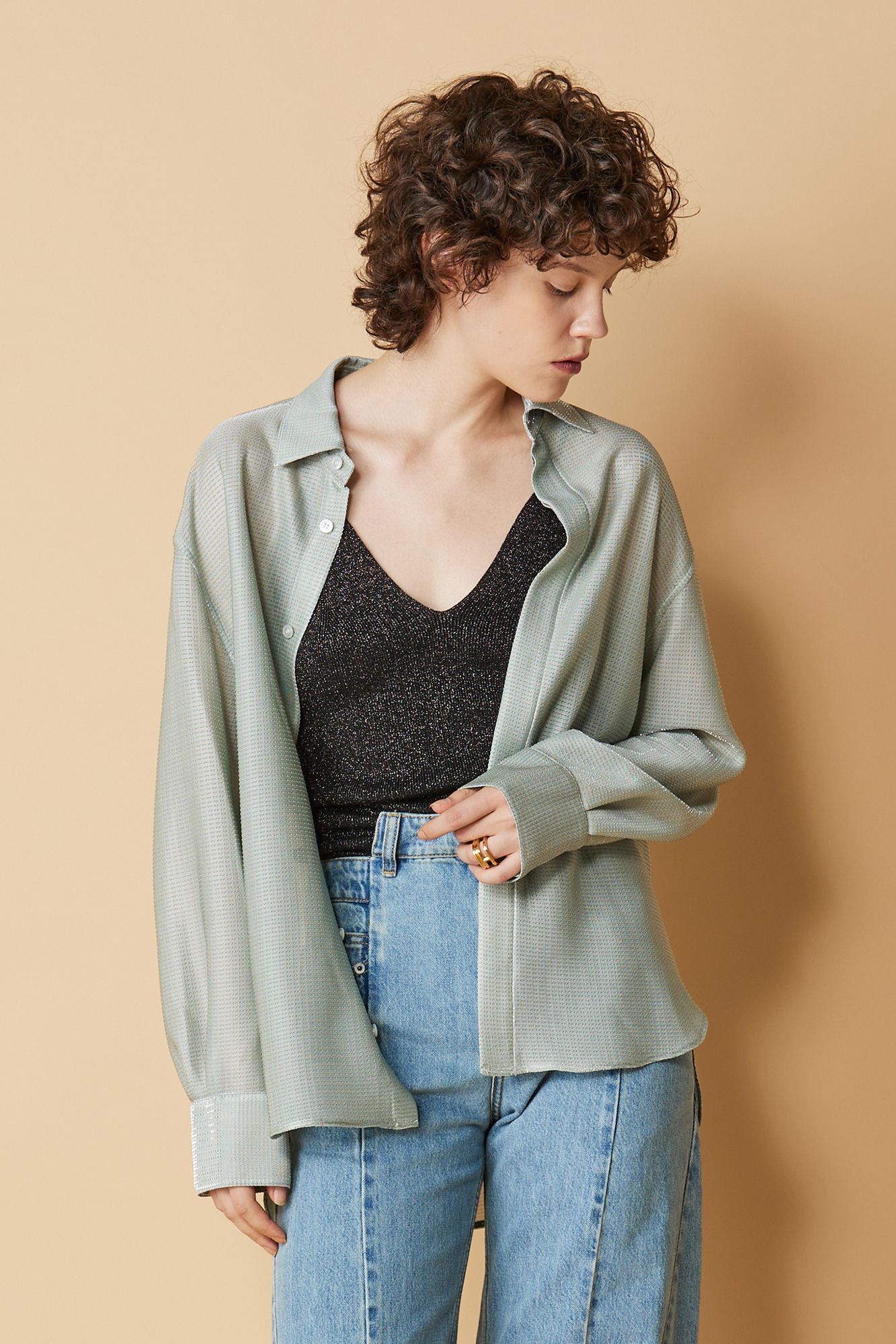 シャギーっぽい起毛感が華やかなトップスは、薄手で涼しくほんのり透け感も。スクエアな形が特徴的なプチスリーブが前後で二の腕をカバーし、上半身をすっきりと見せてくれる。後ろはスナップボタンで着脱も楽々。強撚クレープのベースにカットジャガードでシャギーのような毛足を出し、織組織で陰影をもたせた素材です。1枚で主役級のブラウスです。M7daysってどんなブランド?【Marisolスタッフの自腹買い#113】でも紹介 >