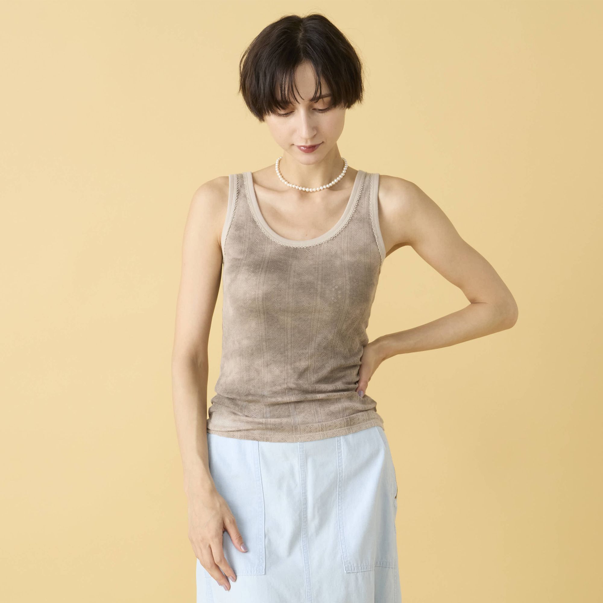 衿ぐりのカーブが効いたタンクトップ。衿ぐりと袖口のピコ刺繍があどけなさとシックさを引き出し、ガーリーな魅力に。透け感あるパターンメッシュに京都の染工場で施したムラ染めが奥行きを生む。ウール×コットンの柔らかな混紡素材。下着のストラップやボディラインを拾わないようフィット感にもこだわった。