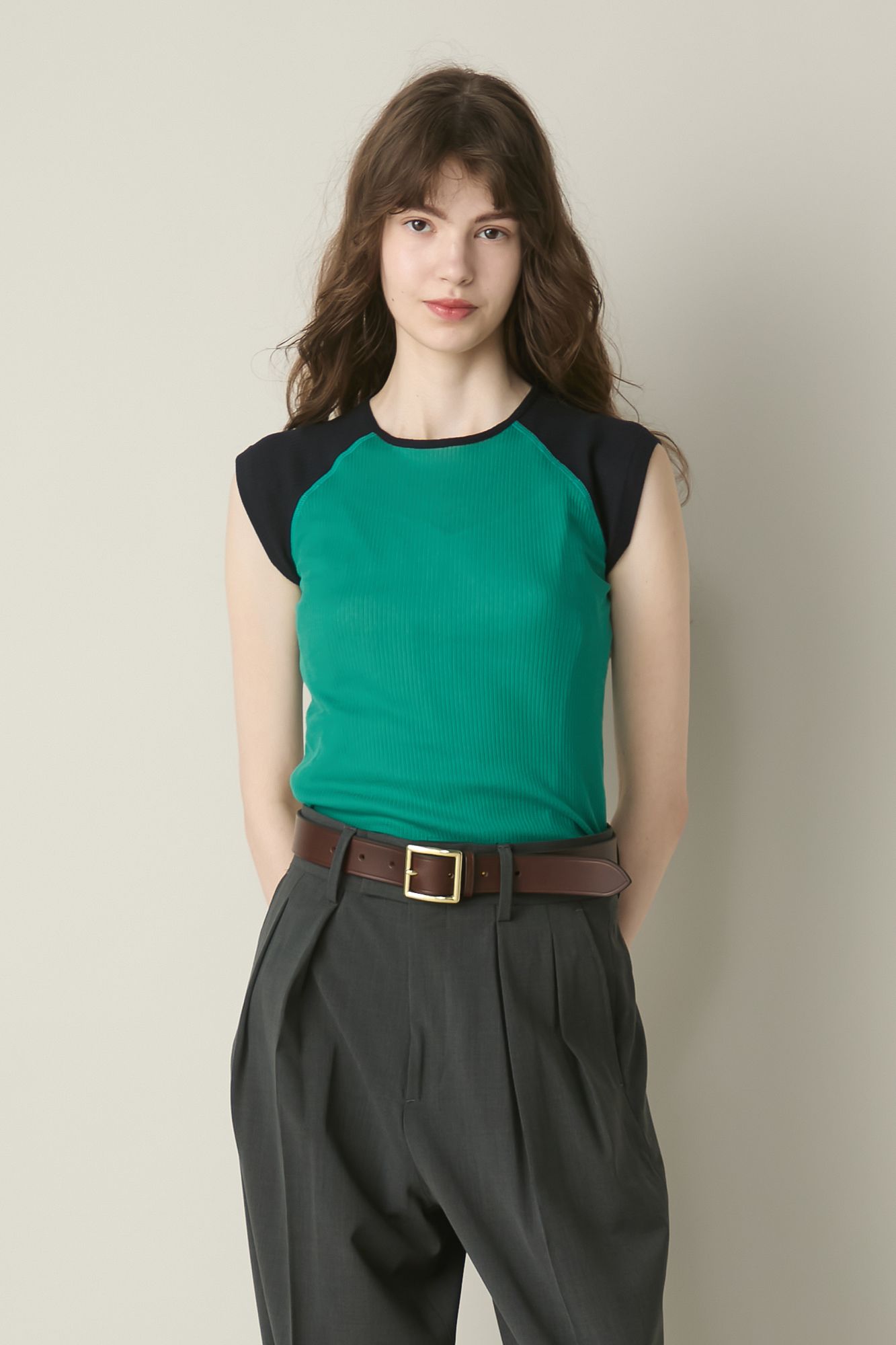 配色のコントラストでぐっと存在感も増す、ノースリーブトップス。タックインもアウトもしやすい着丈バランスで、どこかスポーティーな表情が今季風。着るごとに馴染む優れた伸縮性と優しい肌あたりは、オーガニックコットン100%ならでは。
