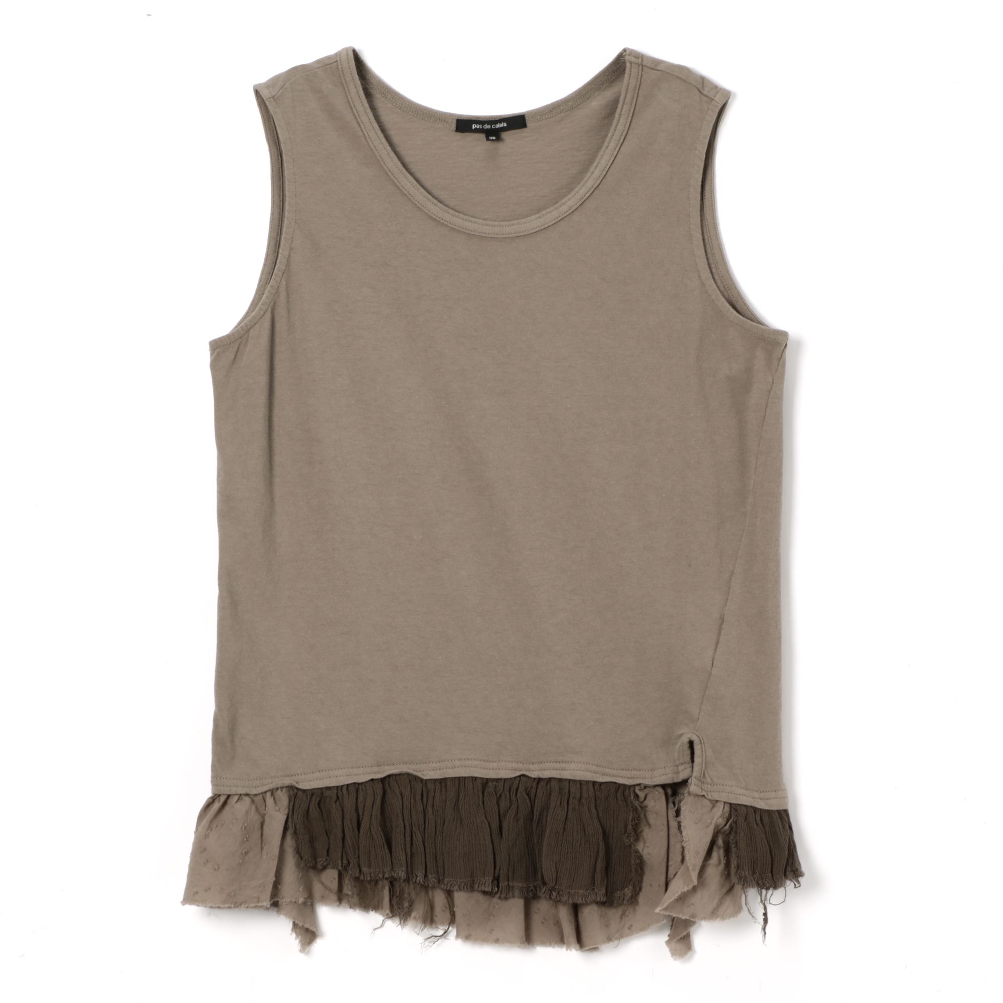これ一着から羽織り物のインまで幅広く着回せる、「パドカレ」定番人気のタンクトップ。裾フリルにシルク楊柳とキュプラシフォンを使った異素材ミックスのアイテムで、いつでも気軽にレイヤードスタイルを楽しめます。ざっくりした裾のカットオフにも注目です。