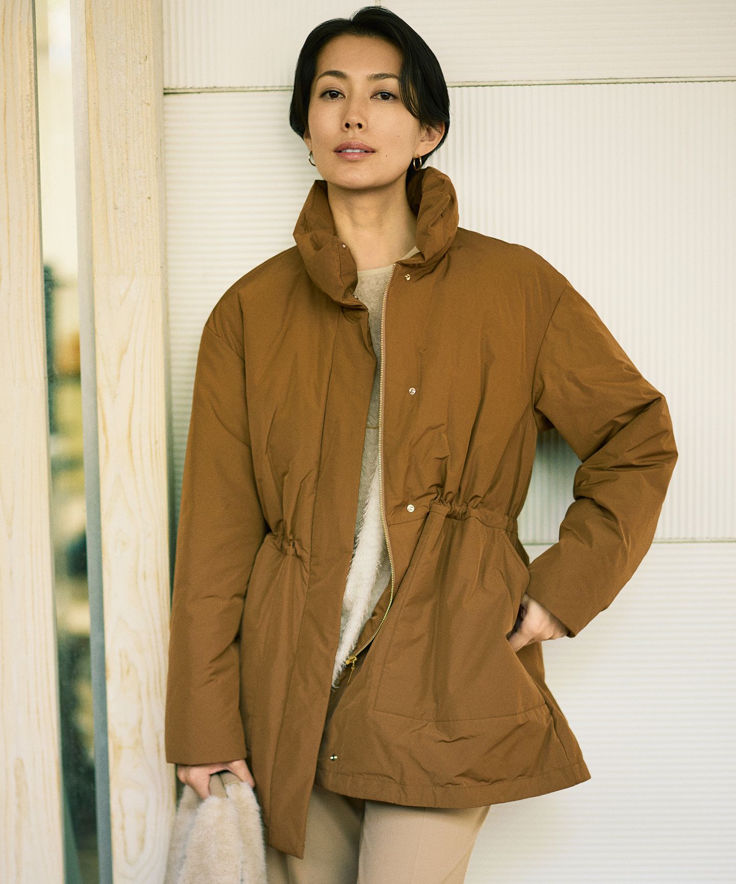 上品な微光沢感がカジュアルすぎずリッチな表情のショートダウン■デザインボリュームと高さのあるスタンドカラーとフードの襟周りがポイントのショートダウンコートです。フードは取り外しができ、スタンドカラーのダウンとしても着て頂けます。たっぷりとボリュームを持たせた今年らしいバランスのスタンドカラーは、上まで閉めても途中まで開けても立体感のある表情が魅力です。裾にかけて程よく広がるAラインシルエットで、気になるヒップ周りを自然にカバーしてくれる前後差をつけた着丈になっております。裾の内側のドロストを絞ってシルエットを変えることもできるので、様々なボトムに合わせて頂けます。また、ゴールドのファスナーでアクセントを効かせています。袖口は風を通しにくい仕様にし、ポケットの内側には起毛生地を使用することで手を入れた時に冷たさを感じにくいよう細部にまでこだわり抜いた1着です。■素材独特のハリコシ感のあるメモリータッチの素材です。程よい微光沢があり、繊細な奥行のあるカラーに染めることで、カジュアルになりすぎず大人っぽいリッチさを感じられる表情が特徴です。ご家庭での洗濯が可能なイージーケアも嬉しいポイントです。■同素材アイテムショートダウンコートII(CMWMGW6504)スタンドカラーダウンコート(CMWMGW0520)※画像はサンプルを使用している為、実際にお届けする商品と仕様、加工、サイズが若干異なる場合がございます。予めご了承ください。※撮影環境の都合上、実際の商品と色味が異なって見える場合がございます。
