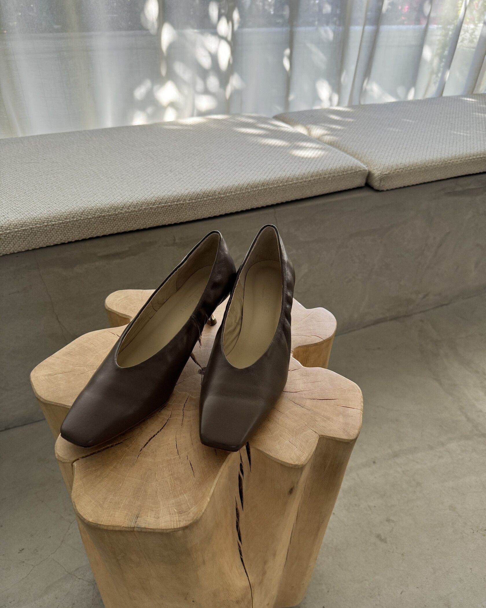 ニュアンスのあるミディアムグレーとなめらかなスムース素材で、モダンに仕上げた別注パンプス。やや甲深なフォルムやサイドに施されたシャーリングも特徴的で、包み込まれるようなソフトな履き心地を実現。足がきれいに見えるスクエアトゥも高ポイント!深めのトップラインとサイドにシャーリングが入ったデザインで包み込まれるようなソフトな履き心地です。薄めのトゥ先とすっきりしたスクエアトゥで女性らしい雰囲気に仕上げてくれます。さりげなく輝くメタルヒールがバックスタイルにもアクセントをプラス。デイリーはもちろん、セレモニーにも活躍する優秀な一足です。