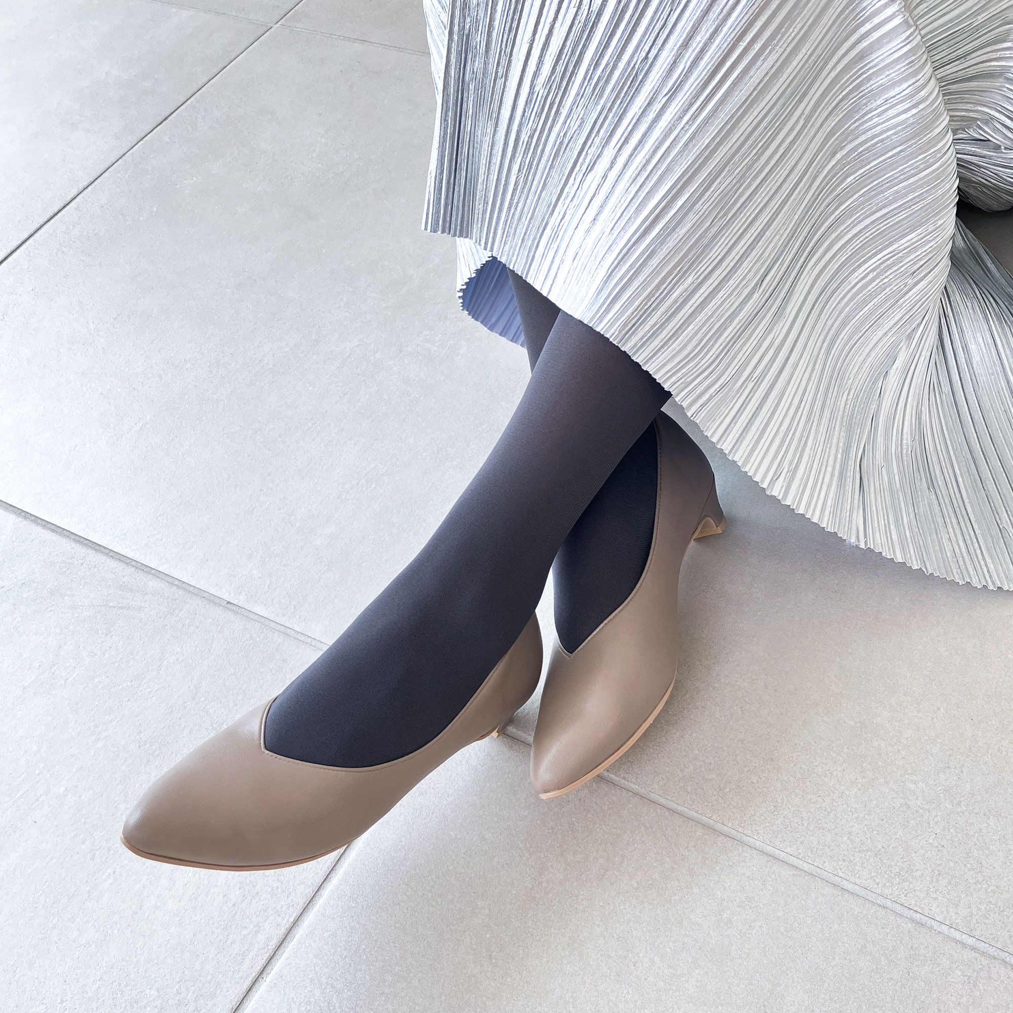 山羊革/羊革を使用した、ソフトな足あたり。5cmのチャンキーヒールは歩きやすいのはもちろん安定感もあり、フォーマルにもカジュアルにもはまるので使える幅も広がります。どんなスタイルにも足元から女らしさやきちんと感をアピール出来るパンプス、クッション性もかなり高いので足裏も楽々、こっそりきれいに楽する女性のおさえておきたい1足です。【APOM -アポム-】A Piece Of Me/A Part Of Me 自分らしいスタイルの仕上げに、靴は欠かせないピースですそして自分の一部だと思える靴との出会いはかけがえのないものですコンフォートなのにキチンと見えて 1 日中履いていられるミニマルでタイムレスなデザインでありながら、しっかり現在を感じられる エフォートレスとシックの調和それらをデザインごとに最適な製法・パターンを用い、 素材本来の特徴を生かすことで表現をしていますいつも一緒にでかけたくなる靴APOM は自分のスタイルを持った大人のリアルスタンダードです