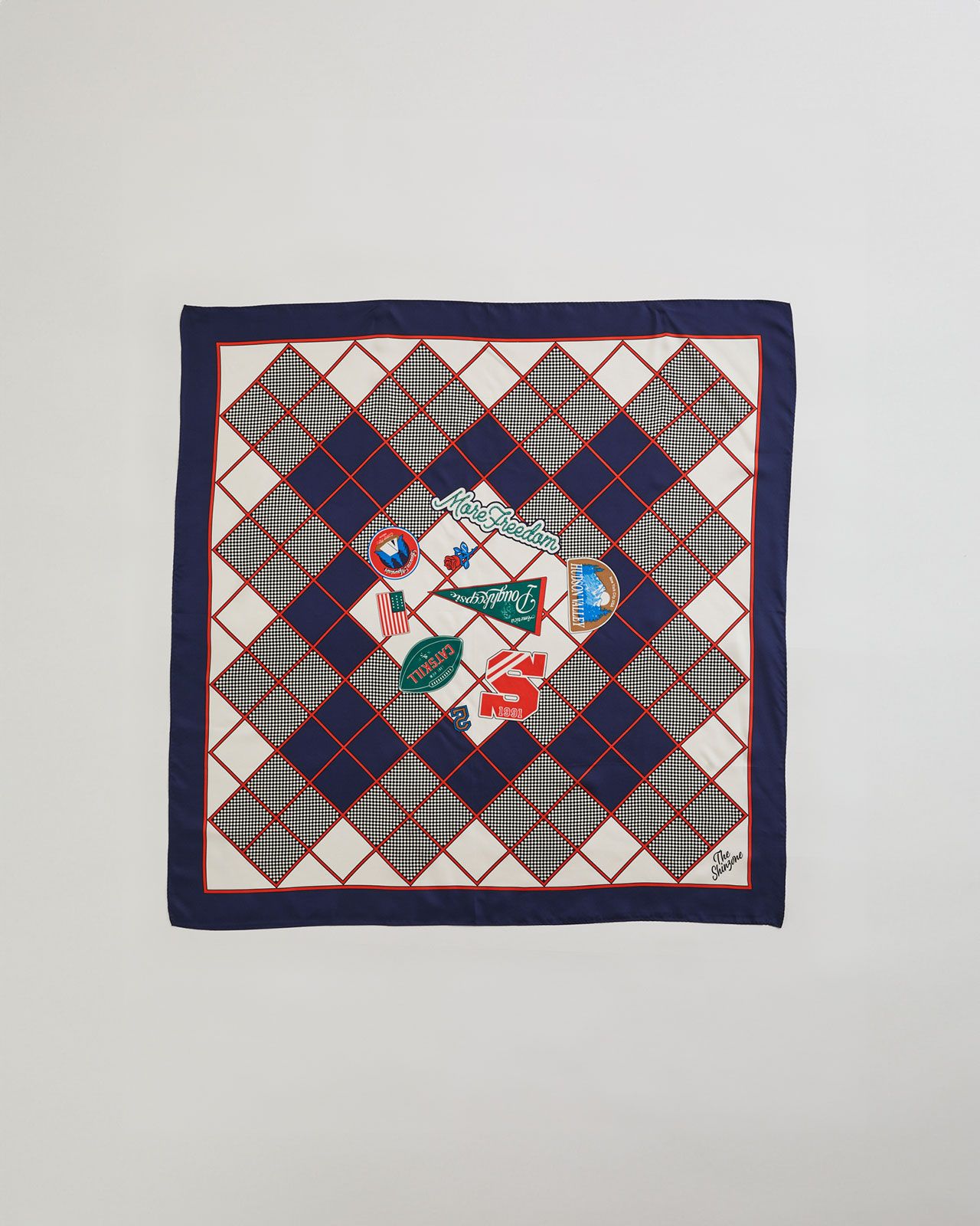 一つ一つに思い出が込められたワッペンたちがどことなくレトロな雰囲気のフラッグチェックの上に散りばめられることで、新鮮な印象に仕上がりました。頭に巻いたり、首に巻いたり、バッグの持ち手に巻いてみたりと使い方は無限大。カラフルで賑やかな柄がコーディネートのアクセントになります。