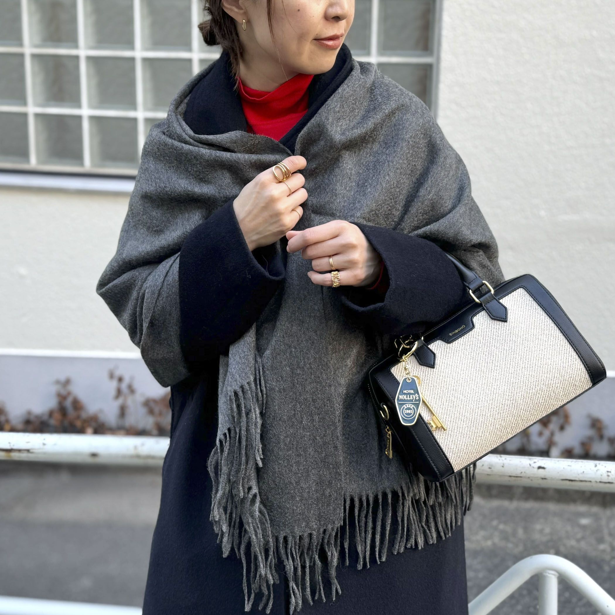 徳原スタイリングに欠かせないイタリアのストールブランド。今季チョイスしたのは、鳥と草花の独創的なモチーフと赤いフリンジがほかにない一枚。大判サイズをTシャツにふわりとまとうだけでおしゃれが格上げされる。ほどよいエスニック感が魅力的。巻き方によって色の出方が変わるのがいい。