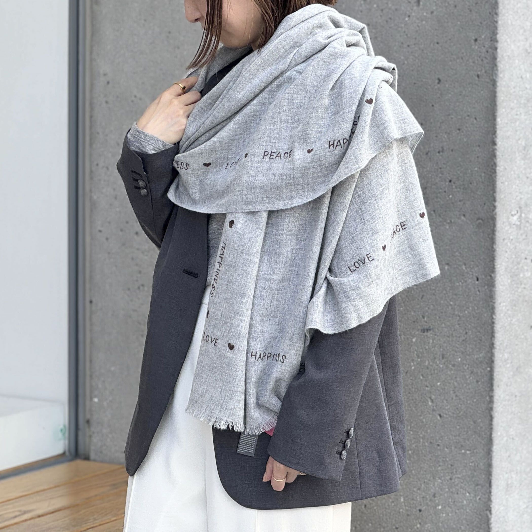 NOLLEY'S ◆Point・人気ブランドCITRUSに別注した、刺繍メッセージストール・NOLLEY'S、HAPPINESS、LOVE、PEACEなどのメッセージがサイドに施されています。・ウール混で適度にボリューム感があり、様々なアレンジが楽しめます。※刺繍部分:ロゴの並びはカラーによって、多少異なります。予めご了承ください。【CITRUS (シトラス)/インド】2005年にスタートしたブランド。クリエイティブディレクターはMadhu Kikka。選び抜かれた職人の技を使い、伝統的で複雑な刺繍を取り入れる等しながら、最新のトレンドをふまえたデザインで、アメリカやヨーロッパ、そして日本でも大人気です。●お取扱い上のご注意●※アテンションタグを必ずご確認の上、着用又はお取り扱い下さい。気になる商品は、お気に入り登録がオススメです!クーポン情報、入荷情報が、通知されるようになります。※店頭及び屋外での撮影画像は、光の当たり具合で色味が違って見える場合があります。 商品の色味は、スタジオ撮影の画像をご参照下さい。※商品画像に関しては出来る限り忠実に表示出来るよう努めておりますが、 お客様がご利用のモニターの設定及び特性により、実際の商品と比較し色味に若干の誤差が生じる場合があります。