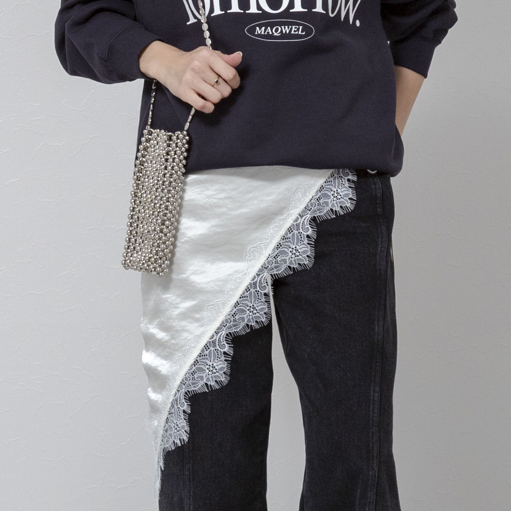 ◇26SS◇MAQWEL◆Point・サテン×レースのトライアングルスカーフ・サイドの紐で結べる仕様なので、ボトムに合わせたり、Tシャツの上にビスチェ風に巻いたりとアレンジ自在・デニムやTシャツなどカジュアルアイテムに合わせると、こなれがUPするアイテム※直径:レース込み 90cm(レースなし:82cm)※高さ:レース込み 54cm(レースなし:51cm) ●お取扱い上のご注意●※末永くご愛用頂くために、アテンションタグを必ずご確認の上、着用又はお取り扱い下さい。※こちらの製品に使用している濃い色の染料は素材の特性上、水や摩擦により色落ちしやすくなっています。ご使用の際は衣類などへの色移りに十分ご注意ください。気になる商品は、お気に入り登録がオススメです!クーポン情報、入荷情報が、通知されるようになります。※店頭及び屋外での撮影画像は、光の当たり具合で色味が違って見える場合があります。商品の色味は、スタジオ撮影の画像をご参照下さい。※商品画像に関しては出来る限り忠実に表示出来るよう努めておりますが、お客様がご利用のモニターの設定及び特性により、実際の商品と比較し色味に若干の誤差が生じる場合があります。※画像の商品はサンプルとなりますので実際の商品と仕様、加工、サイズが若干異なる場合がございます。