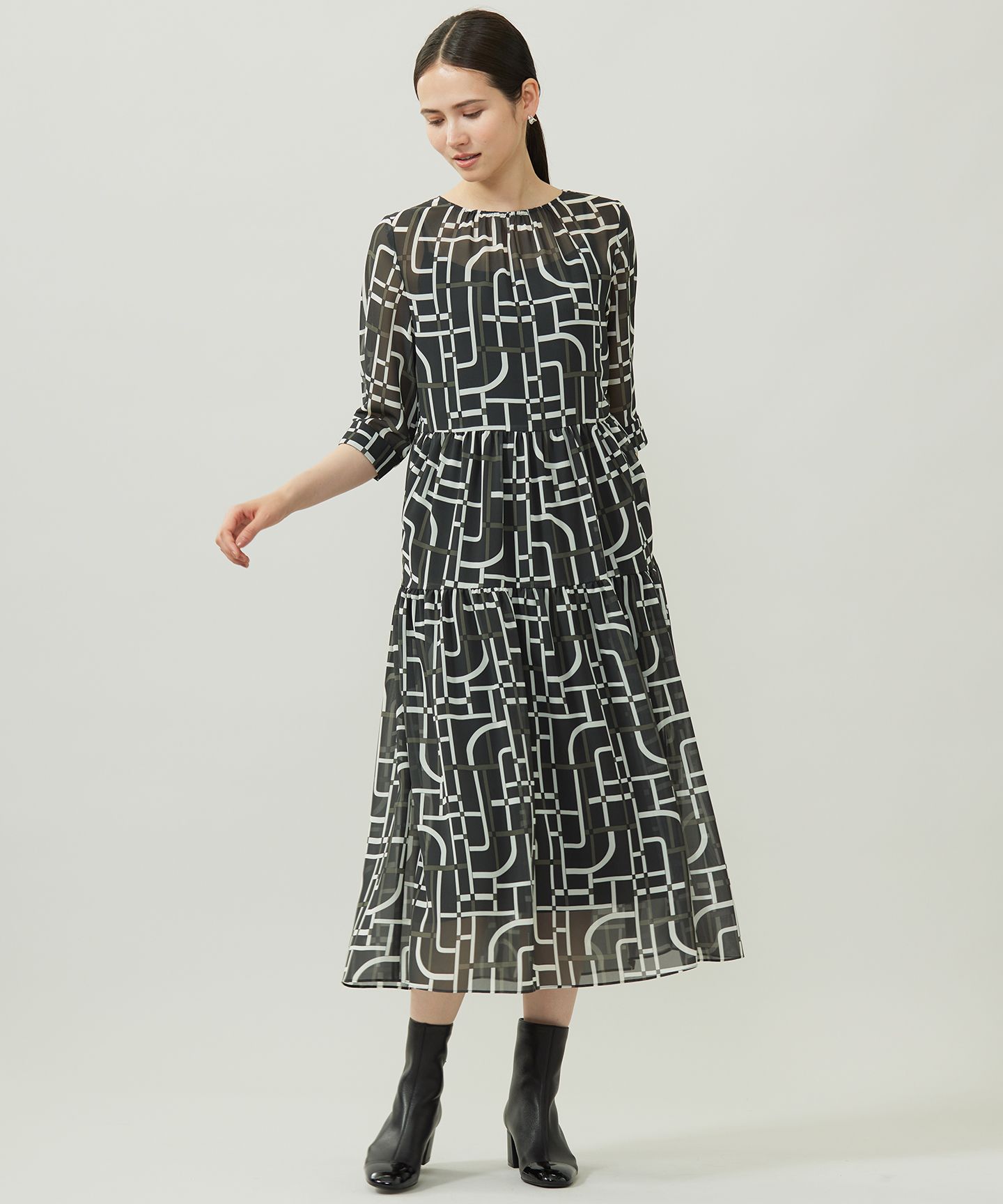 大胆な幾何学がレトロな印象のワンピース■デザイン身体のラインを拾いにくいナローシルエットのティアードワンピースです。繊細なジョーゼット素材にギャザーをたっぷり入れた華やかな印象のワンピースです。裾にかけてボリューム感を出すことで、大人っぽくフェミニンに仕上げました。ボリュームがありながらもゆったりし過ぎないように、ウエストのシルエットにこだわりお作りしています。暑い時期にも軽やかに着て頂けるアイテムです。■素材適度なシボ感と透け感が特徴の100d梨地素材です。ドレープ性と肌触りの良さを兼ね備えたユーティリティ素材です。柄は70年代を感じさせる大胆な幾何柄です。差し色を効かせた曲線パターンがレトロでシックな印象です。■同素材アイテムブラウス(BLWMGW0313)※画像はサンプルを使用している為、実際にお届けする商品と仕様、加工、サイズが若干異なる場合がございます。予めご了承ください。※撮影環境の都合上、実際の商品と色味が異なって見える場合がございます。