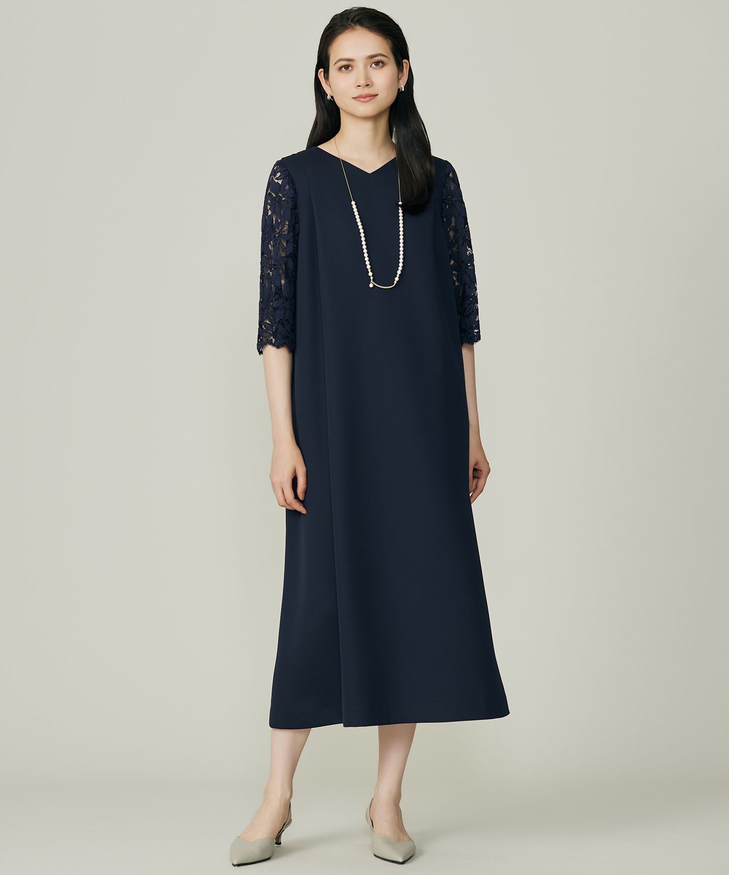 袖のレースが華やかで1枚でサマになるフレアシルエットワンピース■デザイン袖にラッセルレースを使用したフレアシルエットのワンピースです。スカラを施した袖がエレガントで上品な雰囲気が漂うワンピースです。程よく浅めのVネックなので、アクセサリーも合わせて頂きやすいです。様々なシーンに着て頂けるように6分袖で軽く見えるバランス感と、肩から落ちるタックドレープでエレガントなスカートのボリューム感にこだわりお作りしました。1着で凛とした雰囲気になるので、通勤やセレモニーシーン、お食事会などにも活躍します。■素材本体はシルキーなポリエステルを使用しています。二重織で膨らみ感と適度な落ち感が特徴の素材です。水洗い可能でシワが気になりにくいのが嬉しいポイントです。袖のレース部分は、ナチュラル感を表現するためモチーフ部分を綿で構成し、柄際にレーヨンコードを這わせることで、凹凸感を出したデザイン性のあるラッセルレースです。適度な光沢感とハリ感を兼ね備えたのメイドインジャパン素材です。※画像はサンプルを使用している為、実際にお届けする商品と仕様、加工、サイズが若干異なる場合がございます。予めご了承ください。※撮影環境の都合上、実際の商品と色味が異なって見える場合がございます。