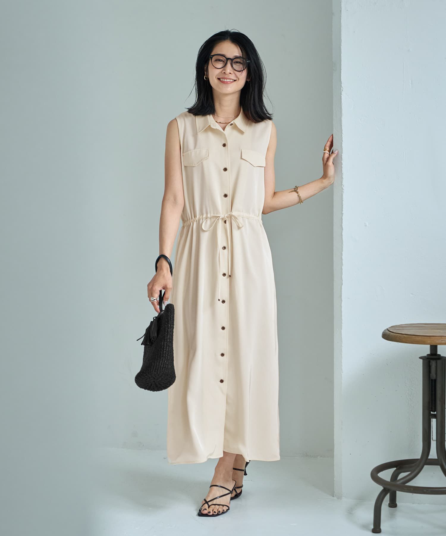 ◆5/14、5/16インスタライブご紹介商品◆?いつものデリより生地やデザインに凝った、ワンランク上のLUXE(ラグゼ)ライン。ウエスト位置のマークができることで、スタイルUPが叶うシャツワンピース。さらさらとした落ち感の良いツイル生地を使用し、涼しい着心地に仕上げています。全体的に少しカッコ良さのある雰囲気になっており、ヴィンテージ加工をかけたダークシルバー色の金属風ボタンでポイントを付けたり、のクールな要素を効かせたのがポイント。襟元は開けて着てもサマになるので、シャツ襟を閉めるのが苦手な方でもこれなら難なく着こなすことができます。◆まったくと言っていいほどシワにならない、速乾性のサラサラ生地を使用。薄手ですがハリ感はあり、キレイなシルエットで着用できます。◆ジャケットやカーディガンとの相性も◎ Vネックニットやベストとの重ね着も可愛く、ノーカラーでVラインのものと合わせるのがお薦めです。◆襟は小さめでスタイリッシュに。存在感が強くないため、顔周りがモタついた印象になりません。◆フロントはボタン開きでフルオープン可能。お好みでジレのように使用したりもできます。授乳中の方にも便利です。◆ウエストには共生地のリボン紐が通してあり、お好みの締め具合でウエストマークをするデザイン。ギュッと締めてもいいですし、ほとんど締めずにストンとIラインで着ても素敵です。◆胸元にフラップ付きポケット風のディテールあり。バストや下着線を目立たせず、メリハリのある見た目を作ります。使用は不可ですが、スカート部分に両サイドポケットが付いています。◆スリットが無いので、脚の露出を避けたい方にもお薦め。それで脚さばきが悪くなることはありません。◆後ろの襟下には控えめなギャザーを付けて、自然な立体感をプラス。背中がペッタリしないように仕上げています。◆クリームは僅かに透け感が生じますので、それなりにインナーにご配慮ください。ペチコートの着用がお薦めです。【商品の特徴】◆着用時期:春夏メイン◆サイズ感:適度にゆとりのあるサイズ感◆丈感:足首が見える程度の丈感◆シルエット:Iラインシルエット◆ギャザー:背面ギャザーあり◆スリット:なし◆厚み:安心感のある厚み◆柔らかさ:しなやかな柔らかさの中にハリ感あり◆着用ジワ:できにくい◆毛羽立ち:できにくい◆伸縮性:なし◆光沢感:なし◆透け感:クリームは僅かにあり(それなりに下着にご配慮ください)◆ボタン:フロントボタンあり◆ファスナー:なし◆ベルトループ:なし◆肩紐調節:なし◆ポケット:両サイドポケットあり(胸ポケットは飾り)◆裏地:なし◆手洗い:可能◆裾上げ:可能◆アイロン:可能(低アイロン)◆ウエストゴム:なし【お色について】◆ブラック:通常の定番的なブラックです。◆クリーム:色の濃いバニラアイスのような、優しいクリーム色。※商品コメントの内容はブランドプロデューサーによる説明文です。